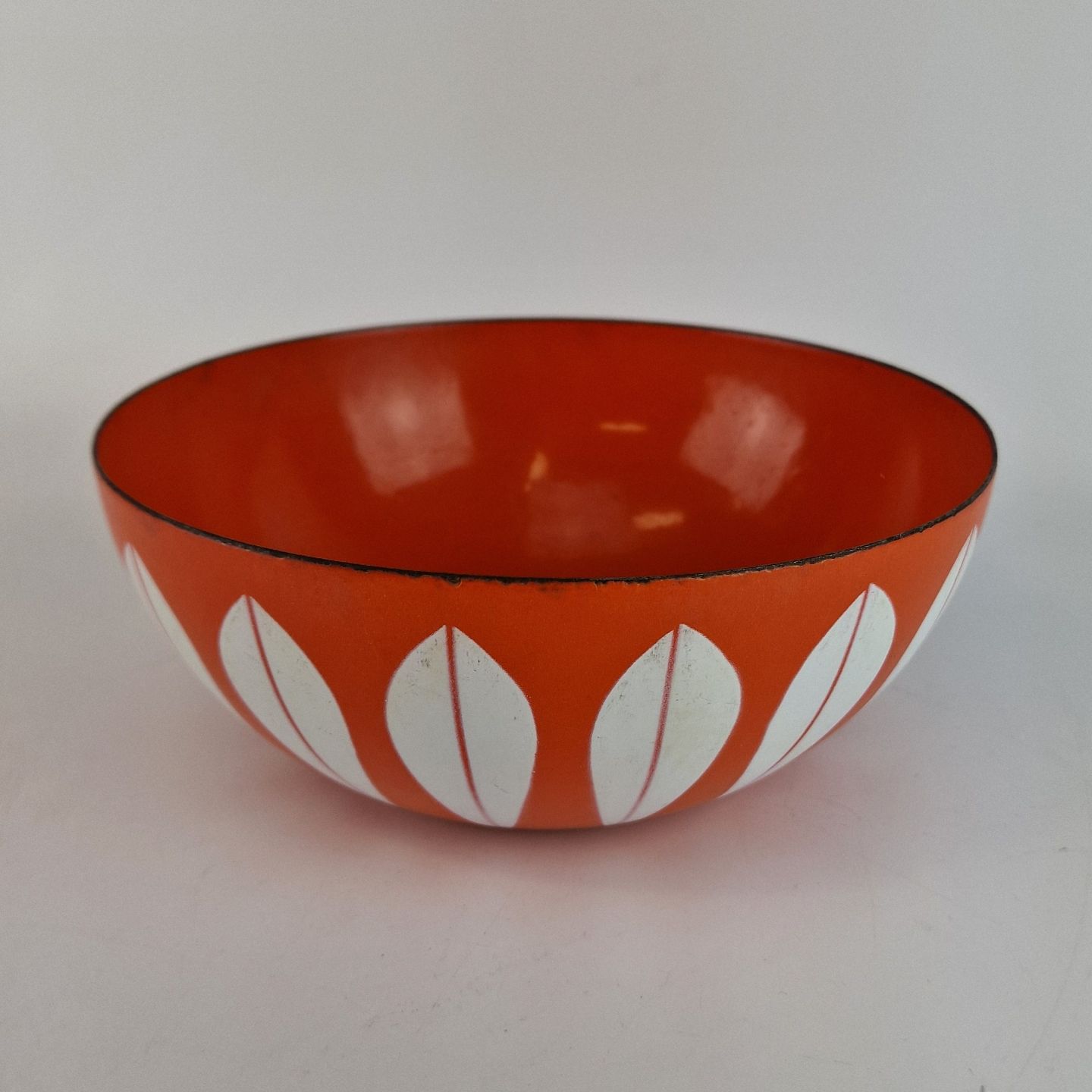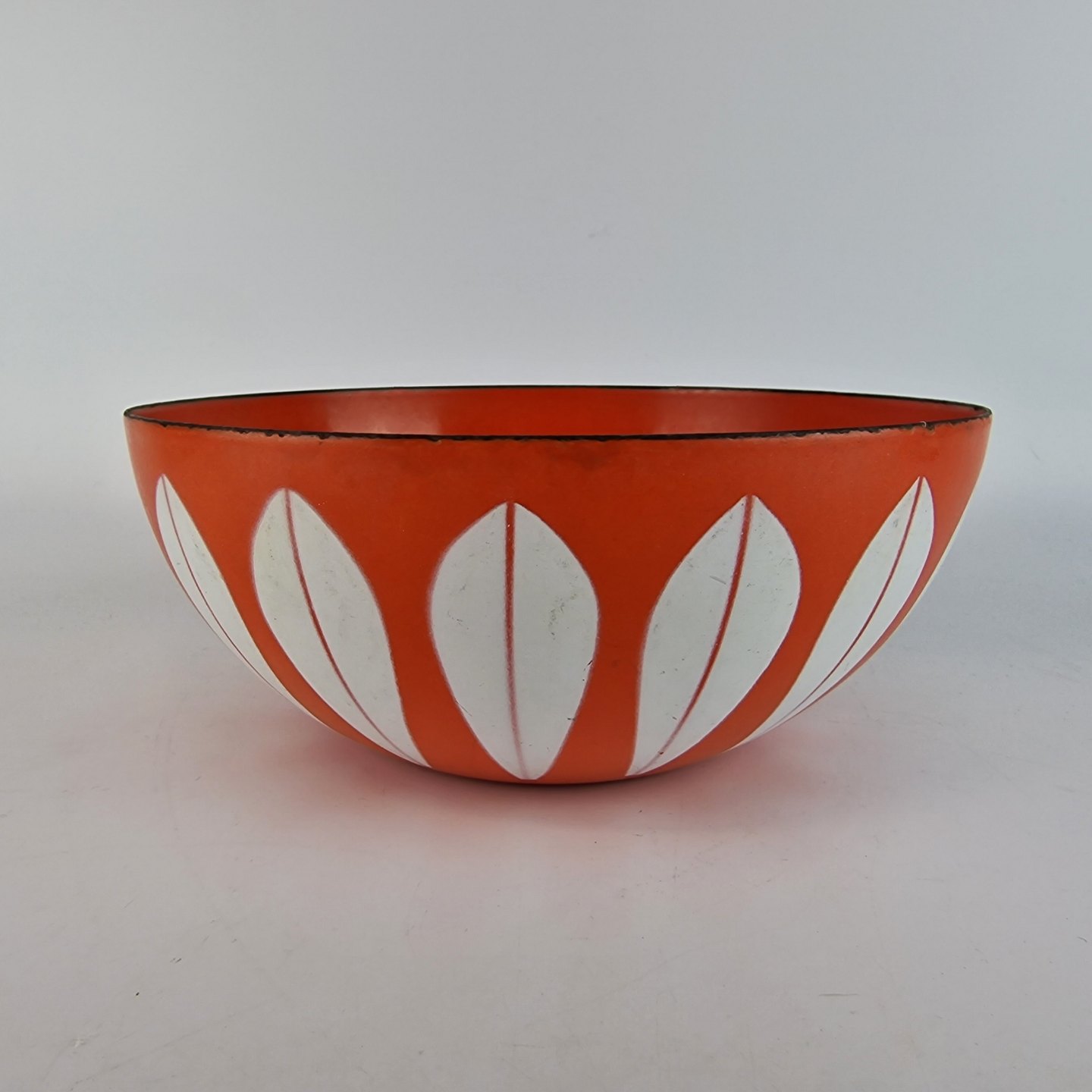 Skål af emalje malet orange og dekoreret med hvide blade, fra serien Lotus. Blev til i 1960'erneFormgiver Grete Prytz Kittelsen (1917 - 2010)