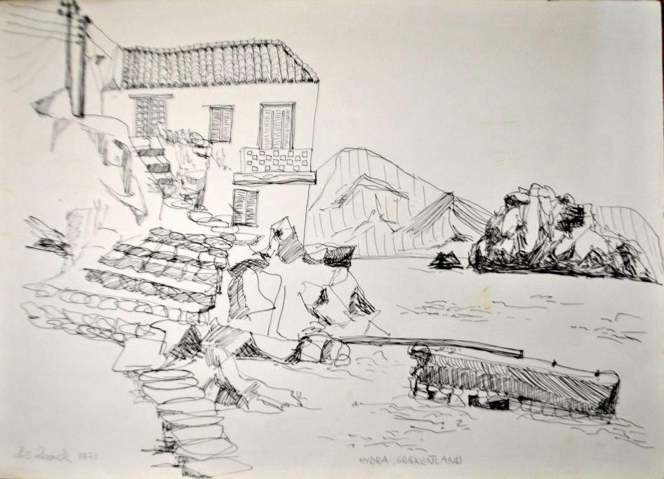 Zwick, Lis (1942- 2020) Danmark/Sverige: Hydra, Grækenland. Tusch på papir. Signeret: Lis Zwick 1971. 42 x 60 cm.Uindrammet.