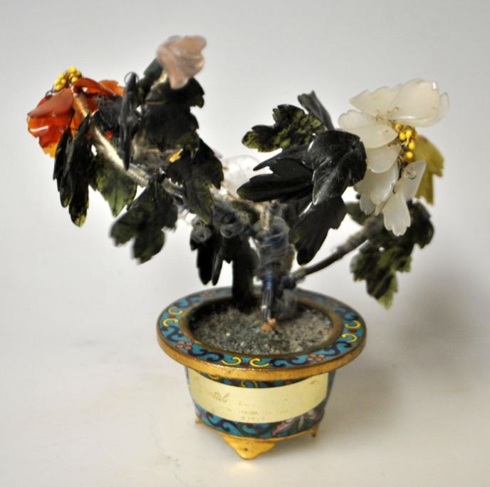 Chinese jade bush in a cloissonne basin, 20th century. Designed as a bush with different colored jades in a cloissonne basin. Height.: 13.5 cm.Item number: 26637