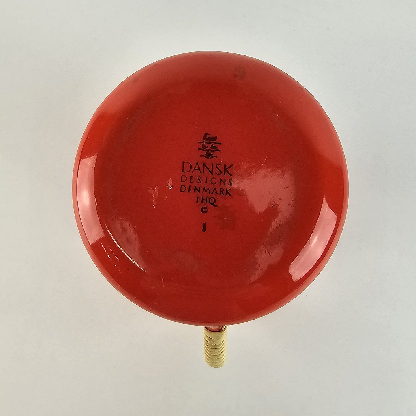 Rød emaljekande med hvid emaljebelægning på indersiden samt hank omviklet af flettet plastDesign Jens Harald Quistgaard