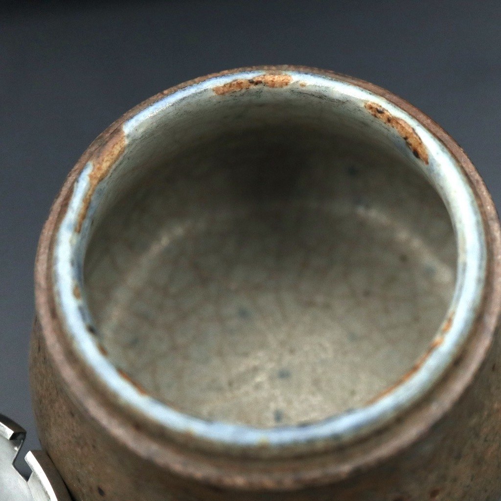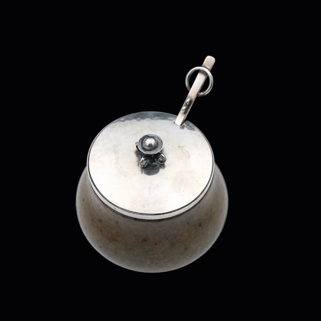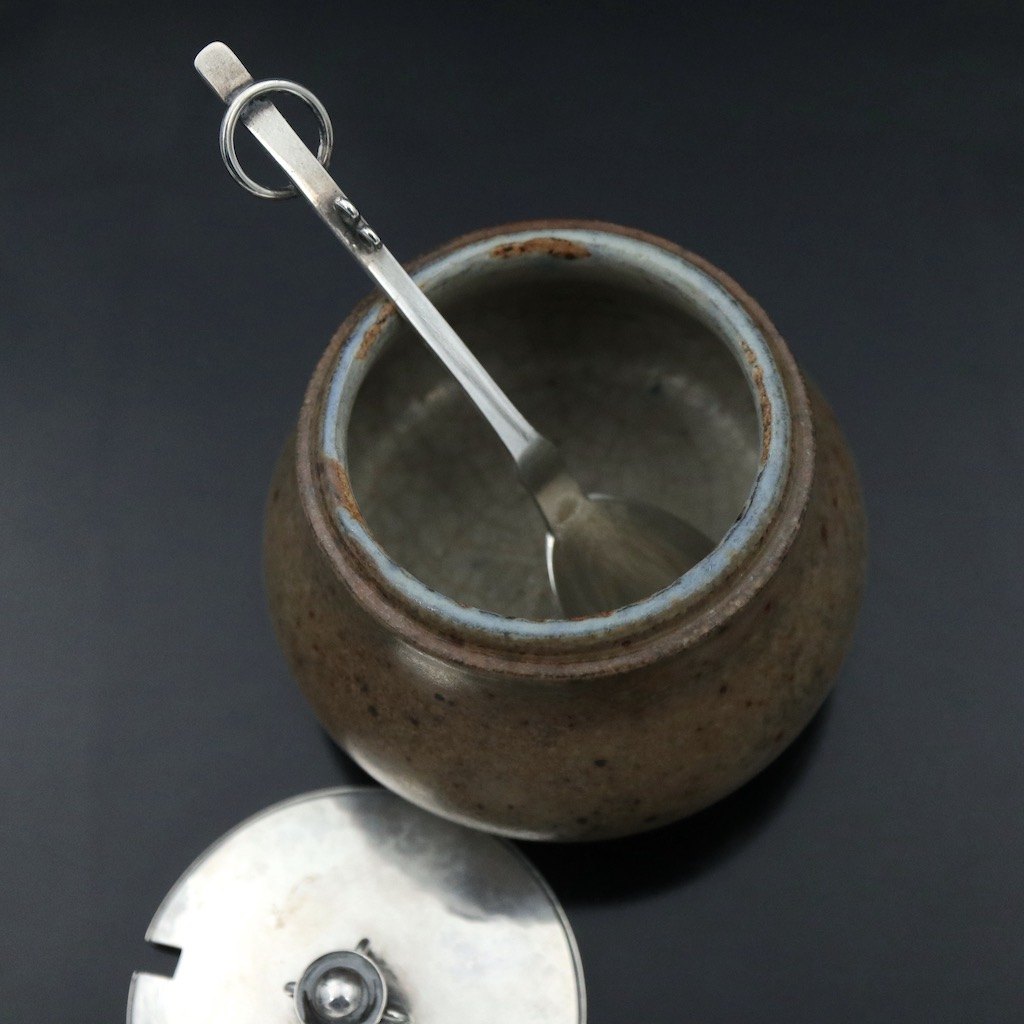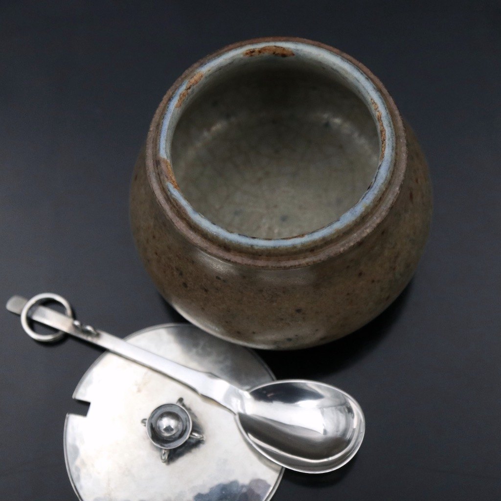 Hans Hansen - Denmark. Stoneware Jar with Sterling Silver Lid and Spoon.Glazed Stoneware Jar crafted for Hans Hansen by Bode Willumsen.