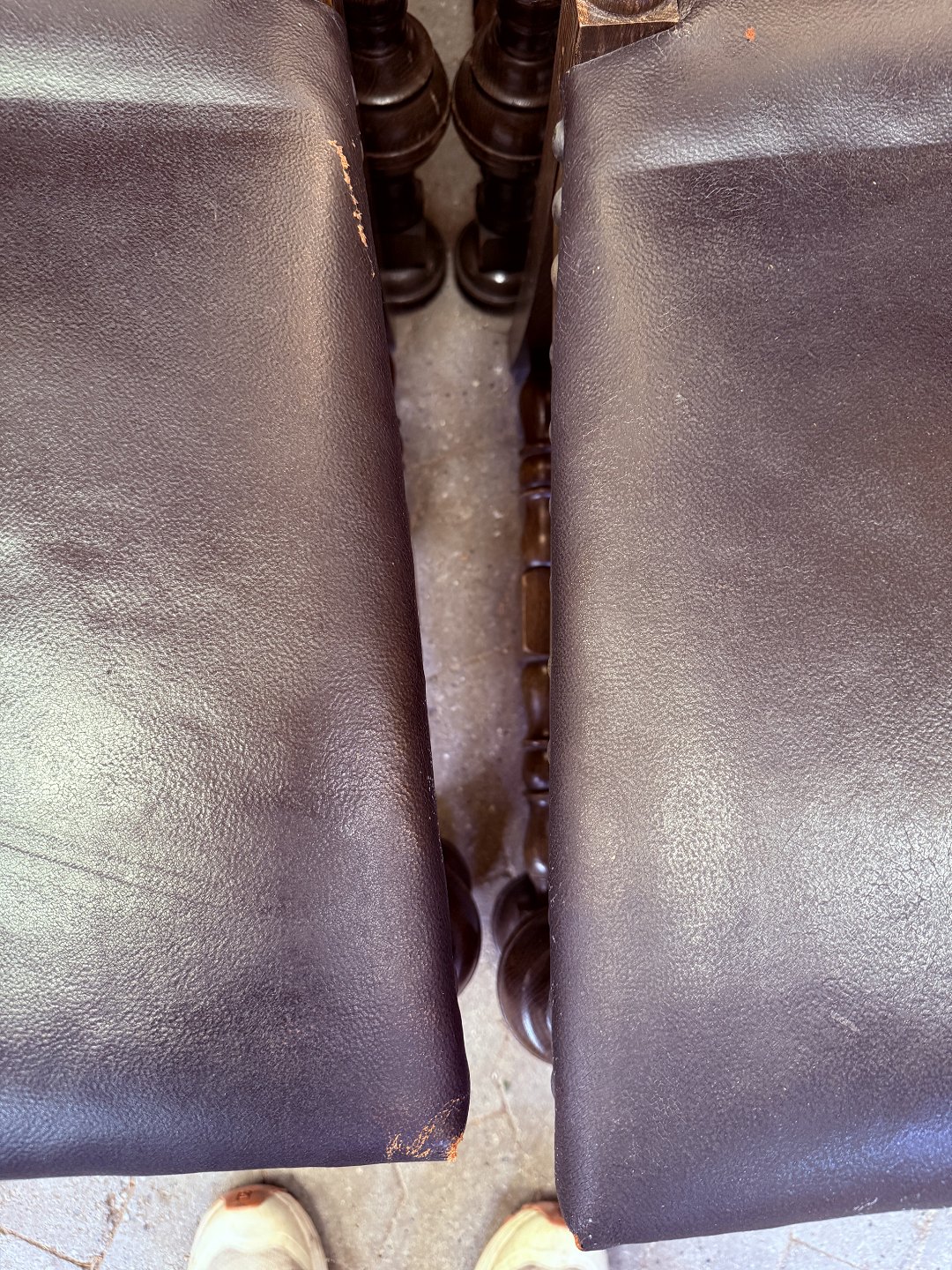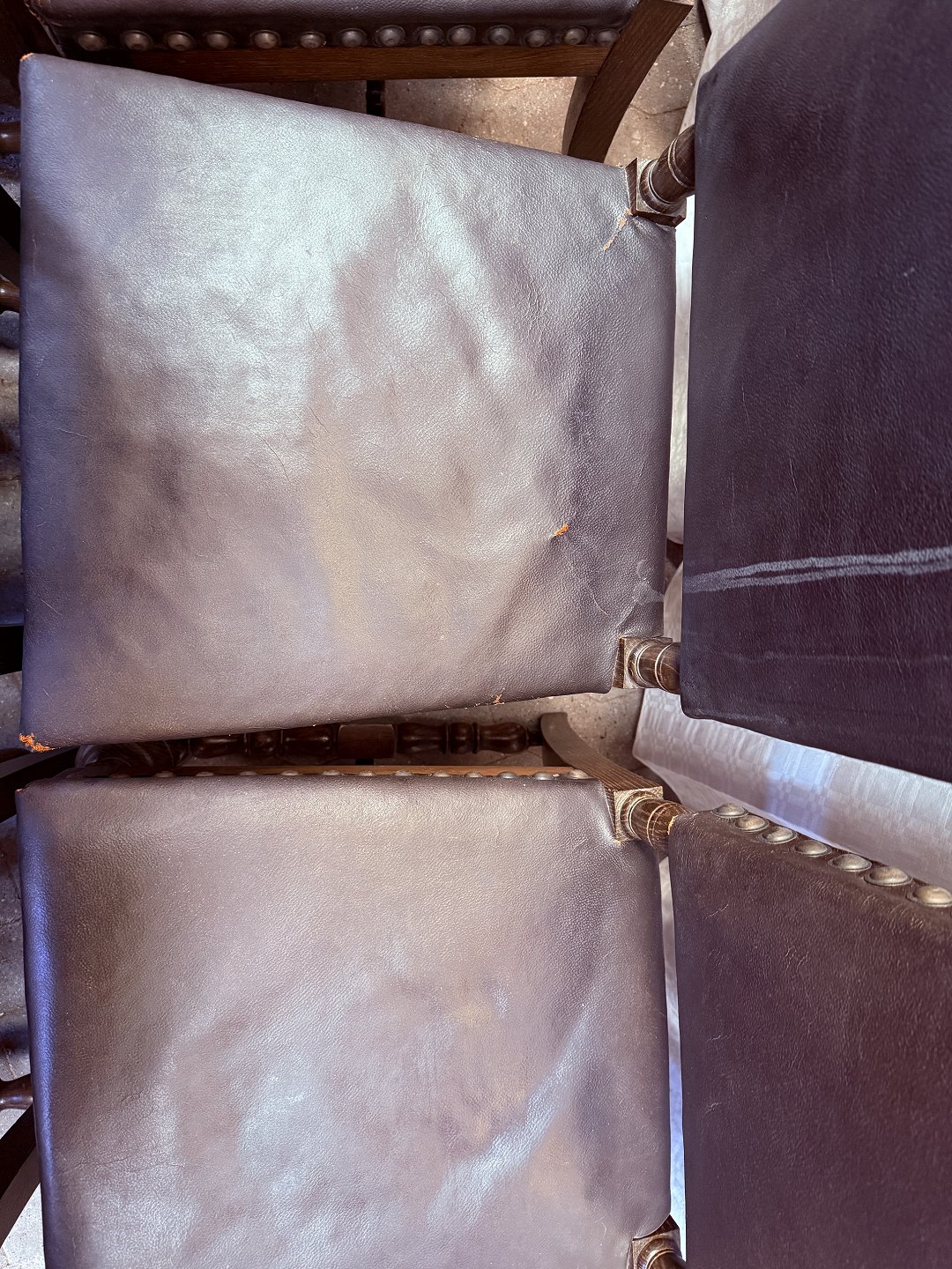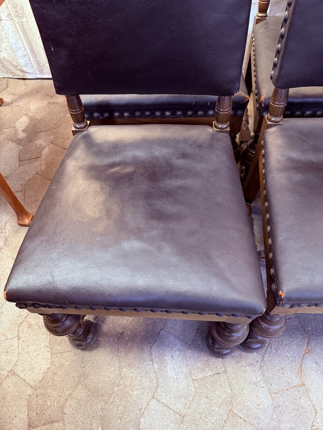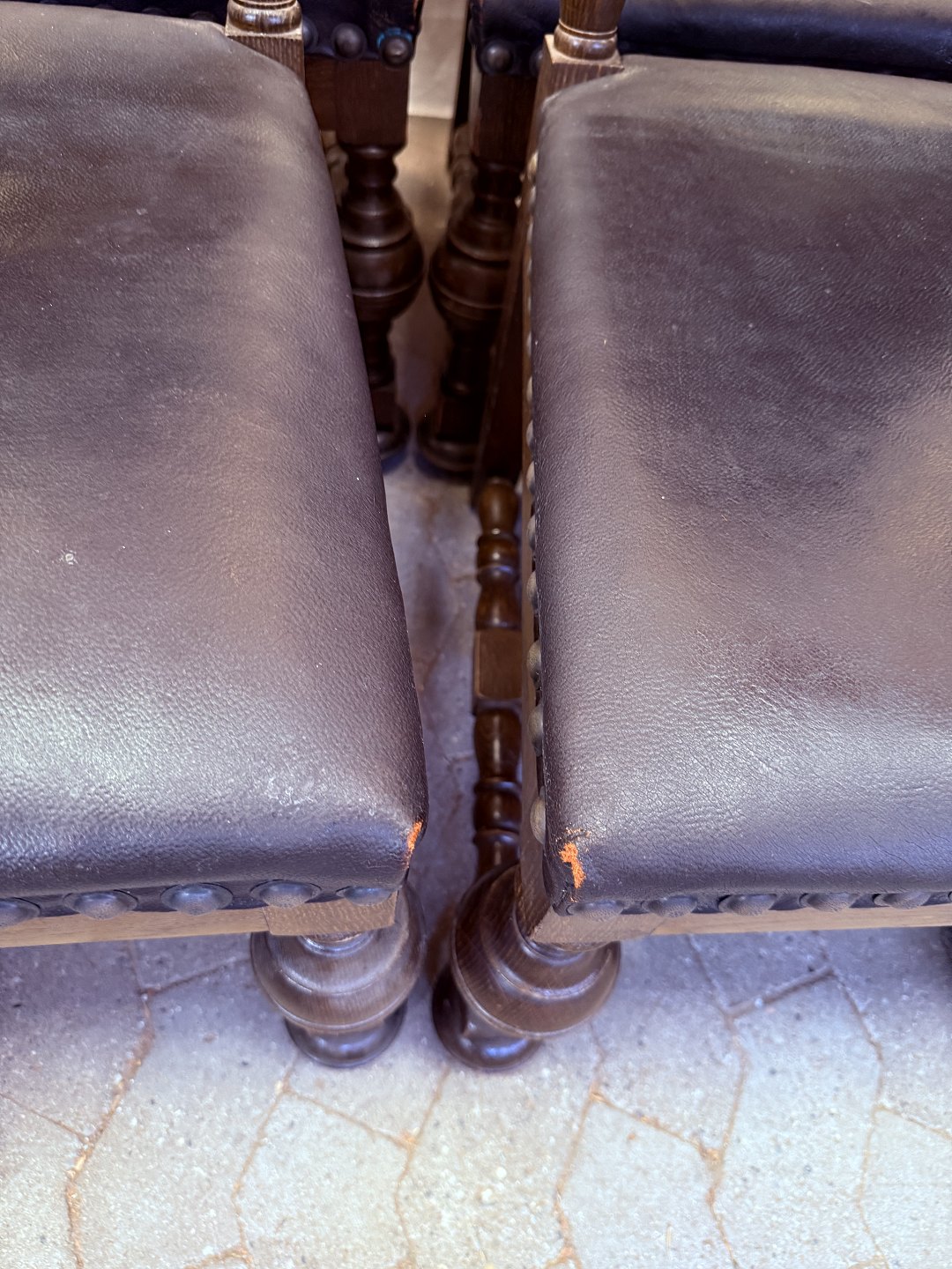 8 Stole i rænnessance stil i massivt egetræ med læderbetræk, fra 1930erne.De har patina.
