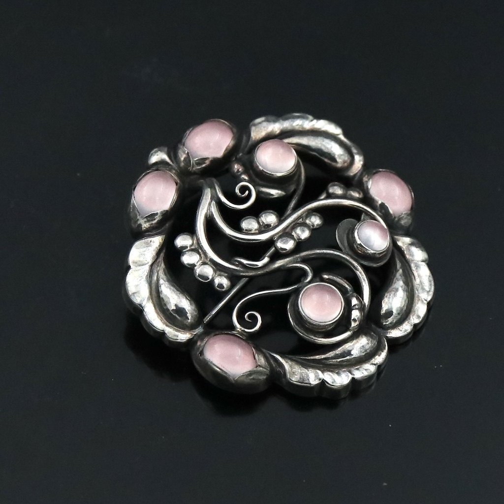 Georg Jensen. Sterling Silver Brooch with Rose Quartz #159.Designed by Georg Jensen 1866 - 1935. Made in Denmark by Georg Jensen A/S.