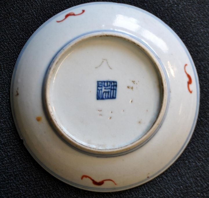Chinese porcelain plate, polychron decorated, 19th century Motif with flowers and script. Signed. Diameter: 12 cm.Item number: 27184