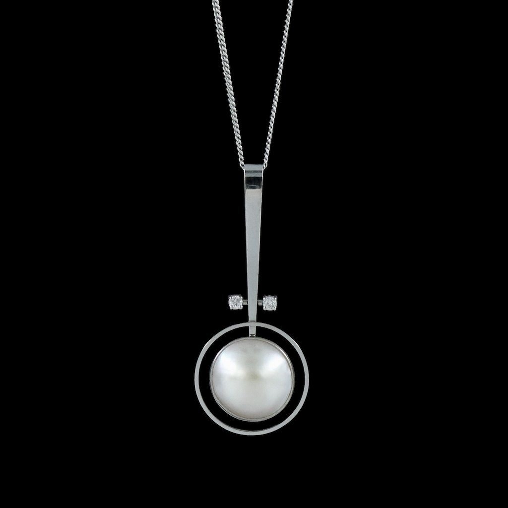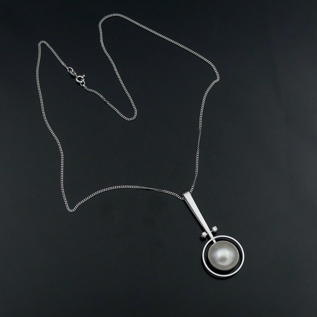 Bræmer-Jensen - Denmark. 14k White Gold Pendant with Pearl and Diamonds.Two brillant cut diamonds of 0.06ct each