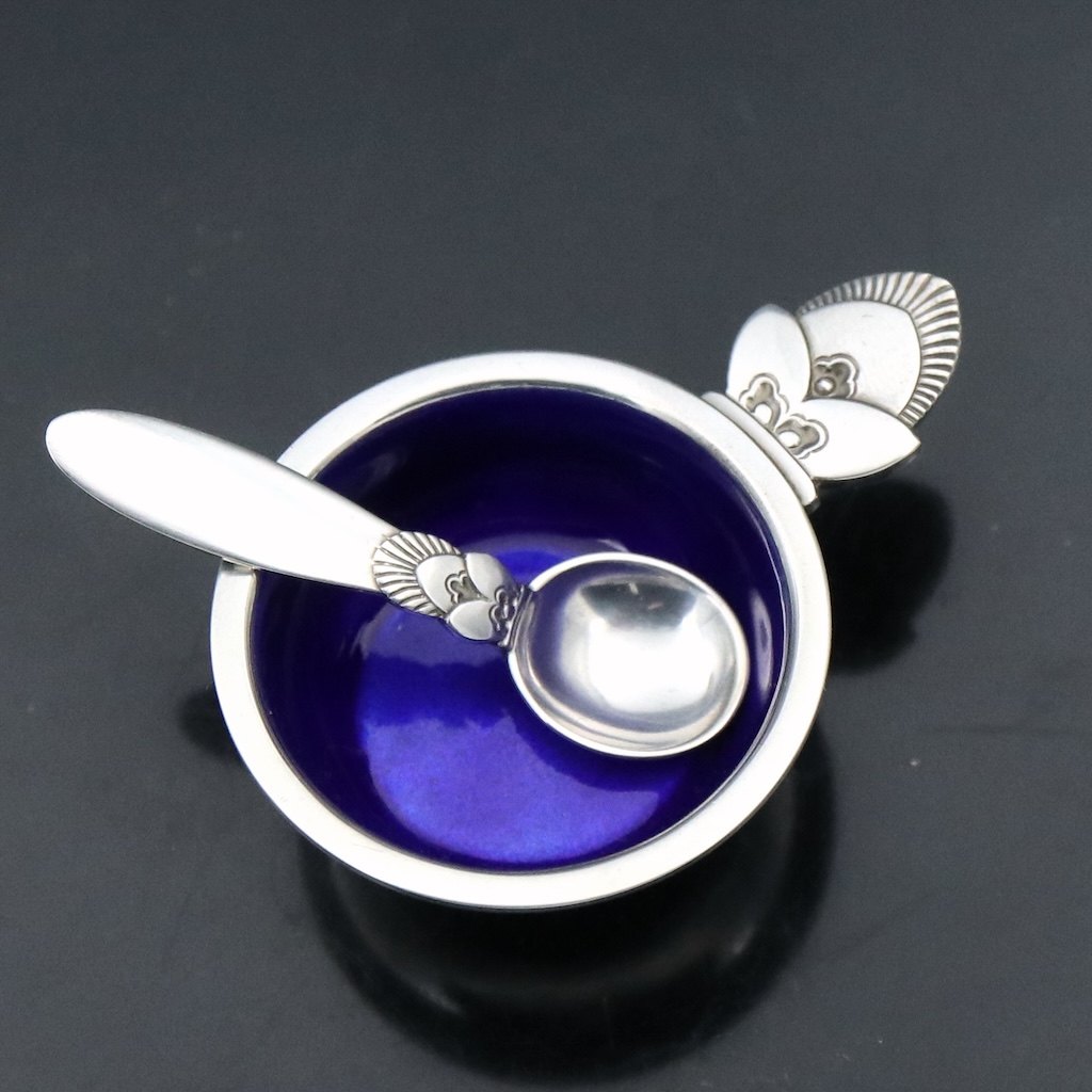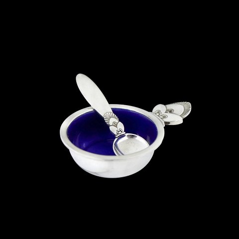 Georg Jensen. Sterling Silver Salt Cellar #102 with Enamel and Spoon 103 - Cactus.Designed by Gundorph Albertus (1887-1970) in 1930.