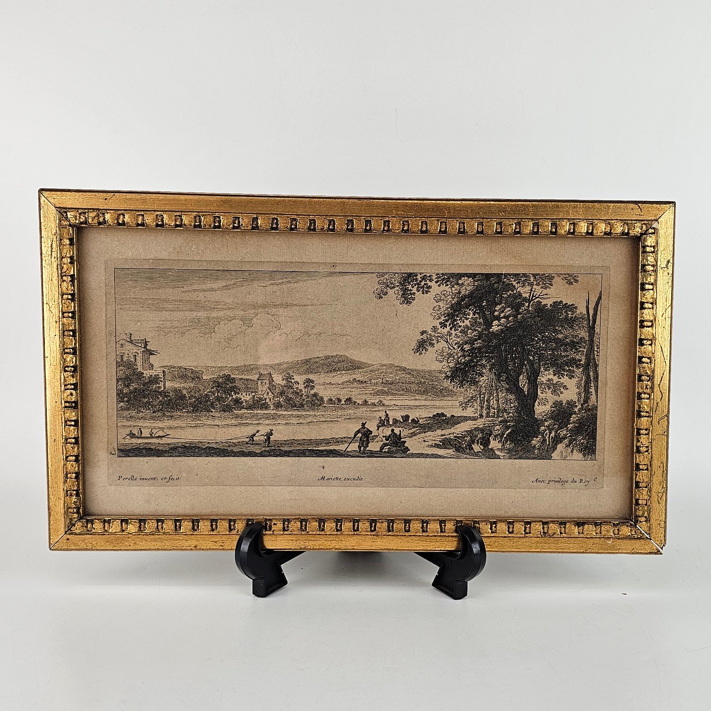 Bogtryk med motiv af landskab med en flod med både på og mennesker der går i forgrunden.Kunstner Gabriel Perelle