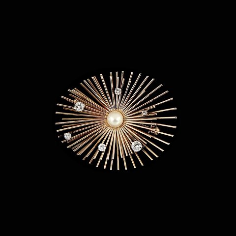 Viggo Wollny. 14k Gold Brooch with Diamonds. 13,4g.Six brillant Cut Diamonds. Largest Diamond of 0.23 ct.