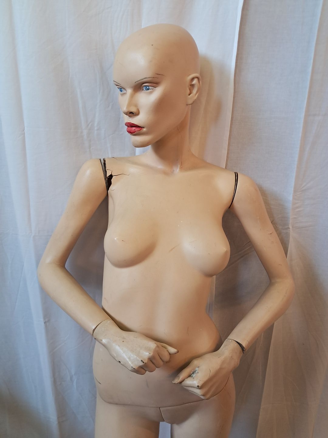 Mannequin fra 1980erne.Den har brugsspor og en defekt på skulderen.