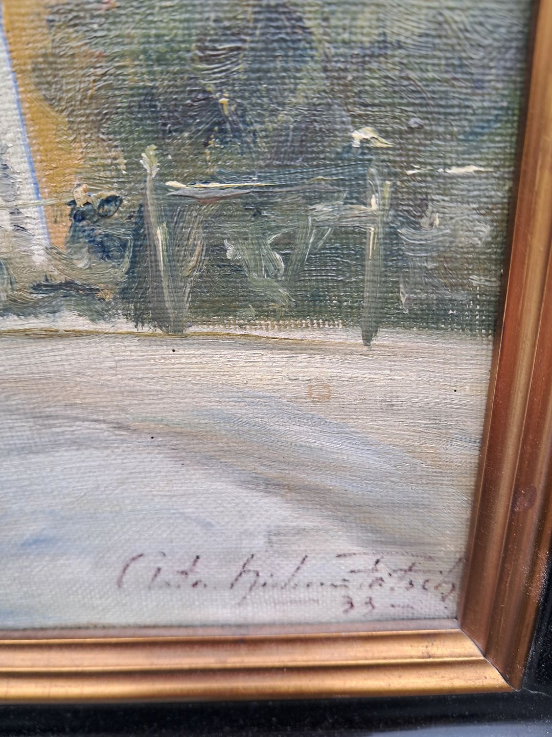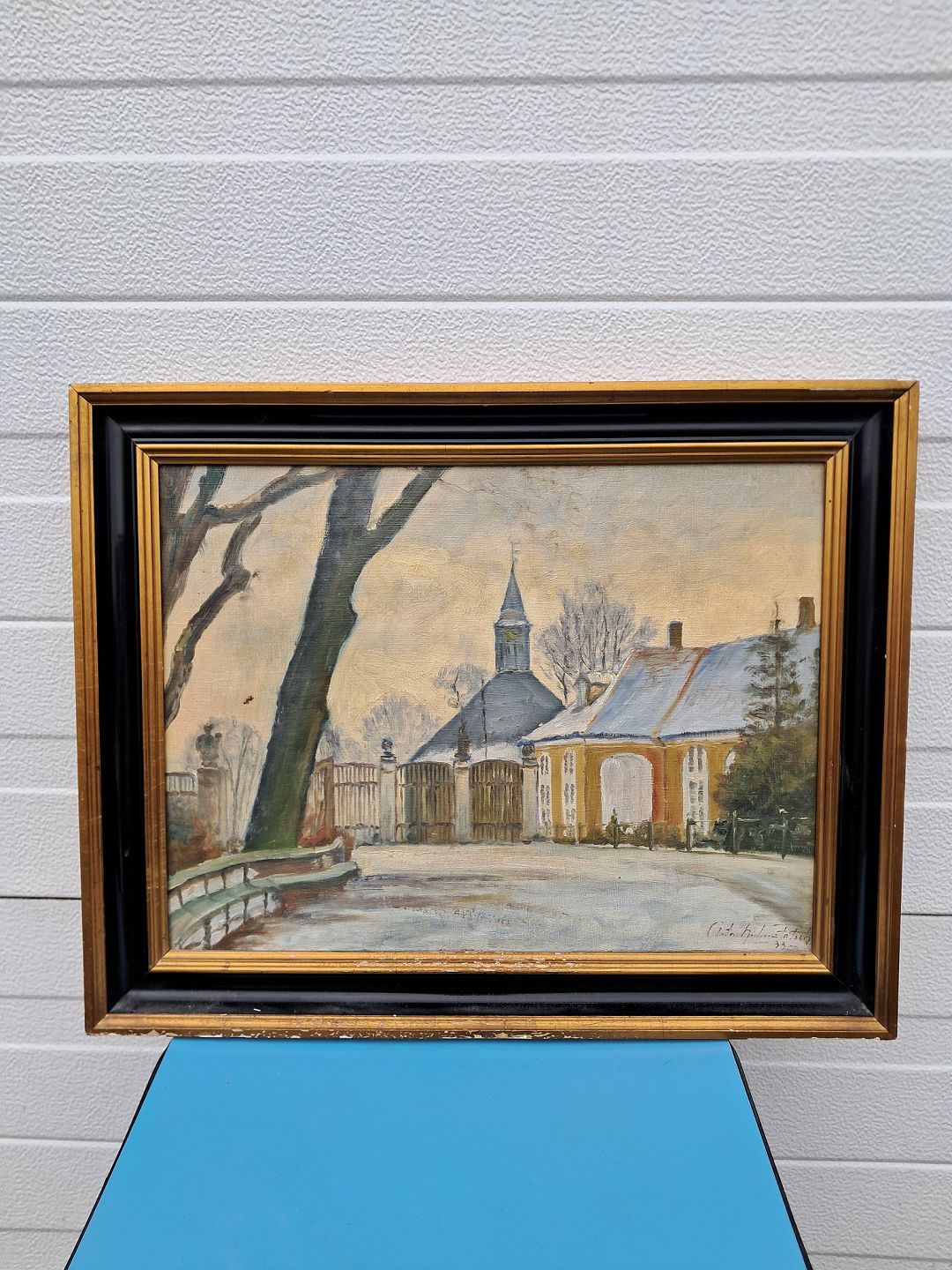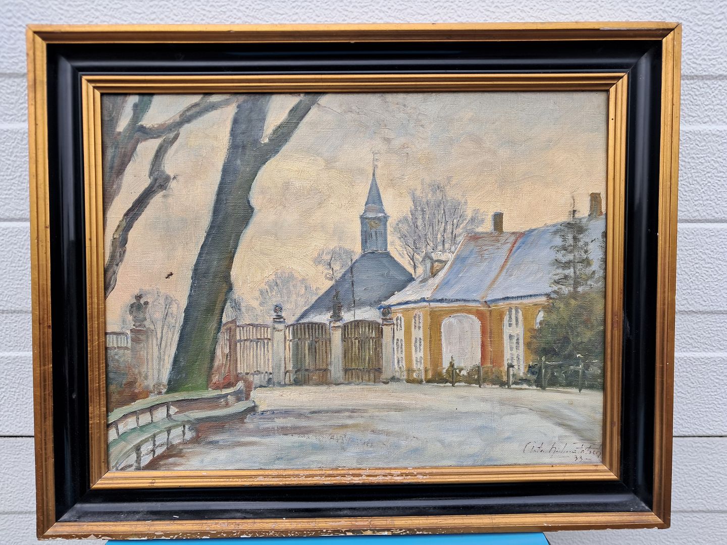 Maleri i guldmalet ramme, fra 1930erne.Det har et lille hul i lærredet.