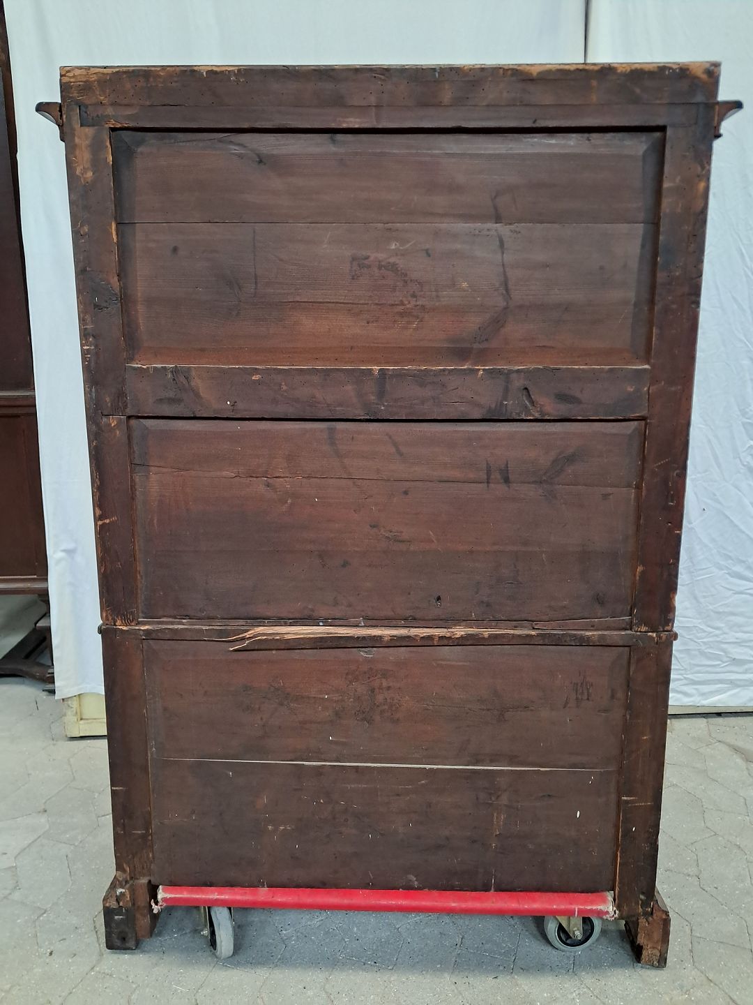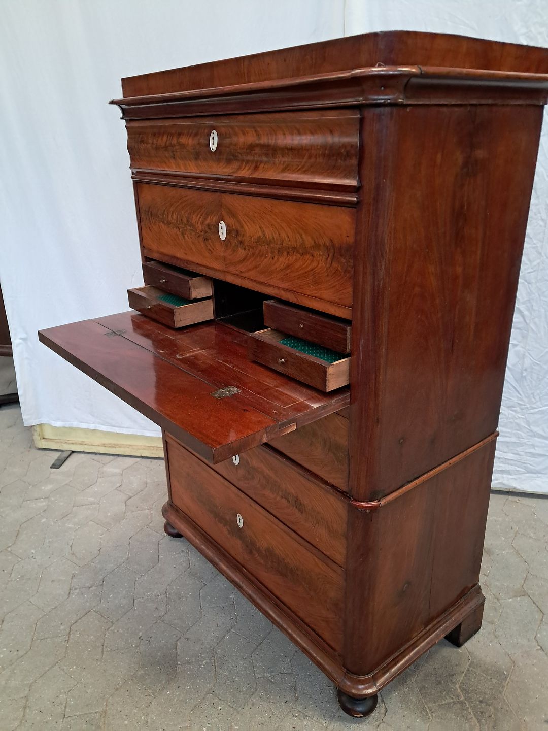Stor kommode i fineret mahogni med skriveplads, fra 1890erne.Den har brugsspor og defekt liste.