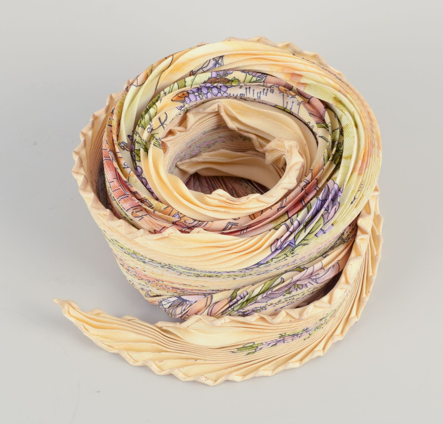 Hermès. Pleated scarf made of 100% silk.'Au Pays de Cocagne' designed by Zoe Pauwels in 2000.
