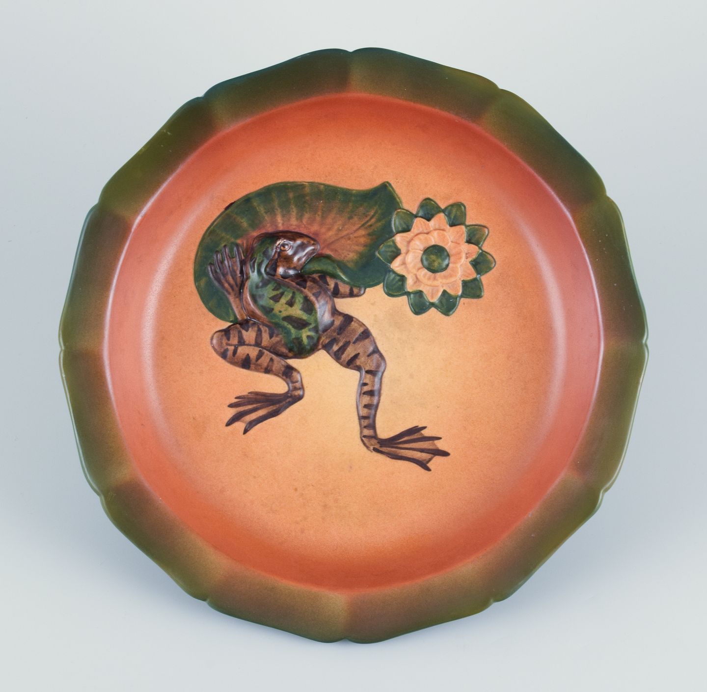 P. Ipsens Enke, Danmark. Cirkulært fad med frø i håndmalet glaseret keramik.Art Deco.