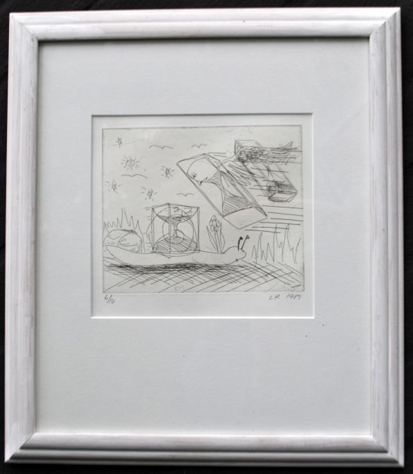 Ravn, Lars (1959 - ) Denmark: Composition, 1989. Etching. Signed: LR 1989. 6/10. H: 16.5 cm. W: 20 cm.Framed: H: 46 cm. W: 40 cm.