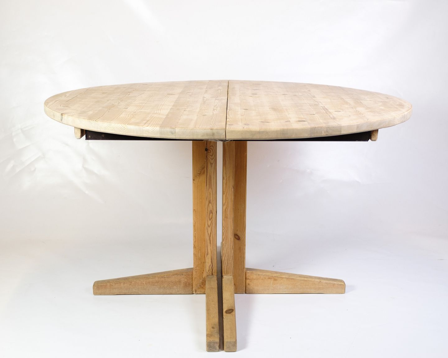 Round dining table with extension in solid pine from the 1970s. Made with a three-legged frame and natural surface. The table comes with two extension leaves that provide extra space as needed. A solid and functional table with classic 70s design.Appears in good used condition. The table will be checked in our own workshop before delivery.