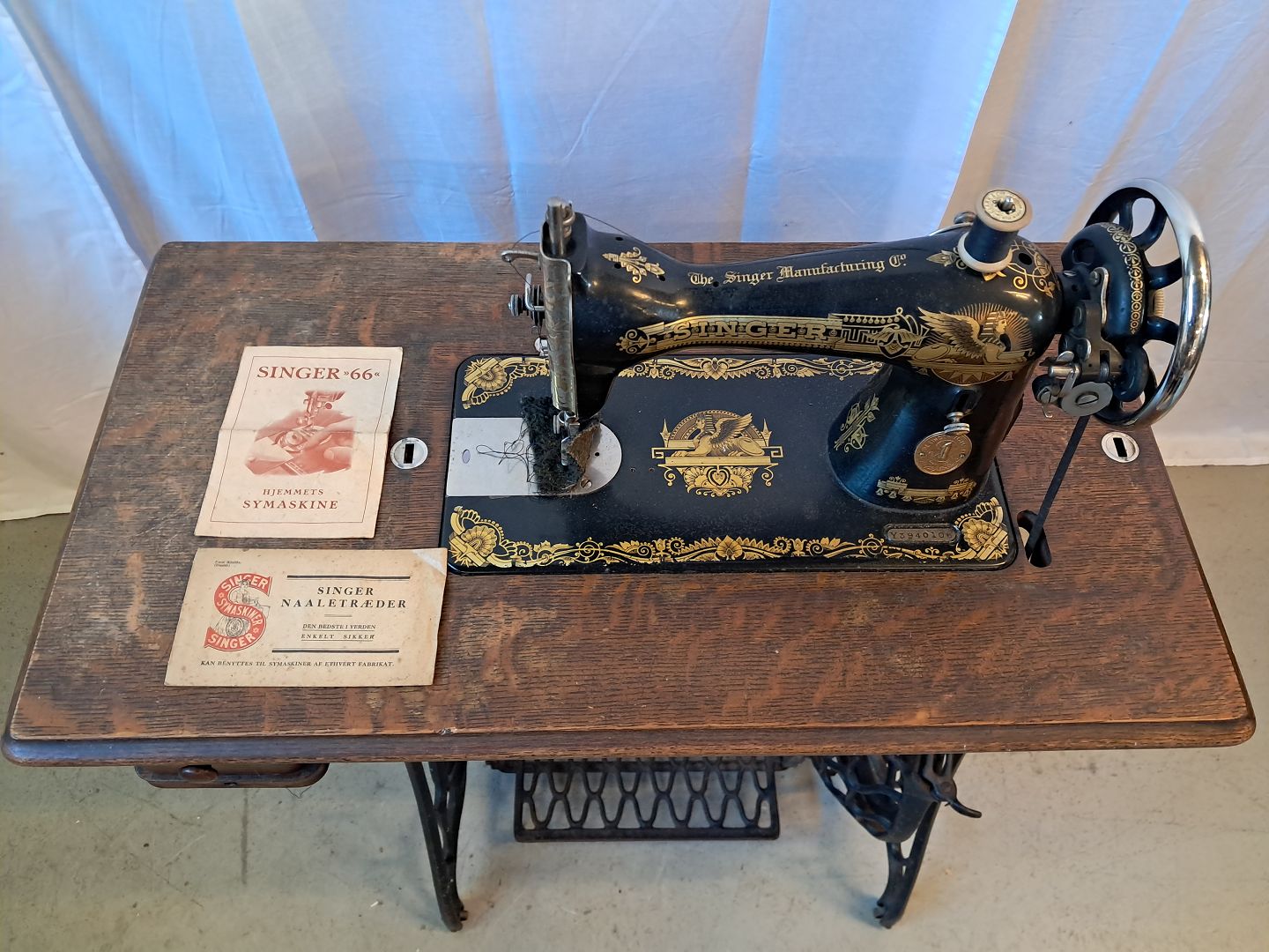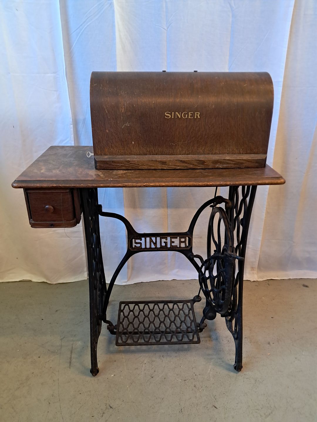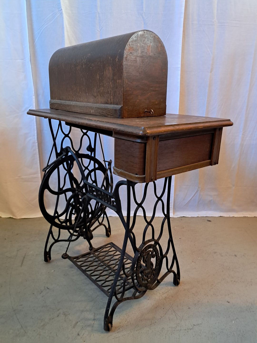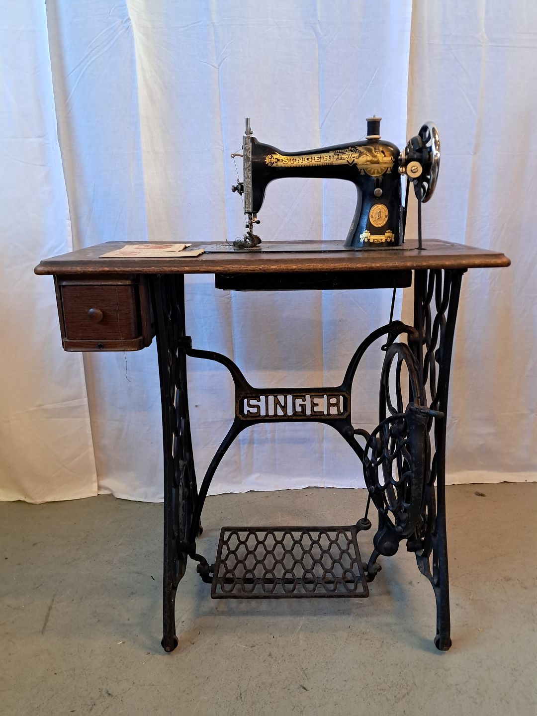Gammel Singer symaskine på metastel, fra 1910erne.Den har brugsspor og vi har ikke tested om den virker.