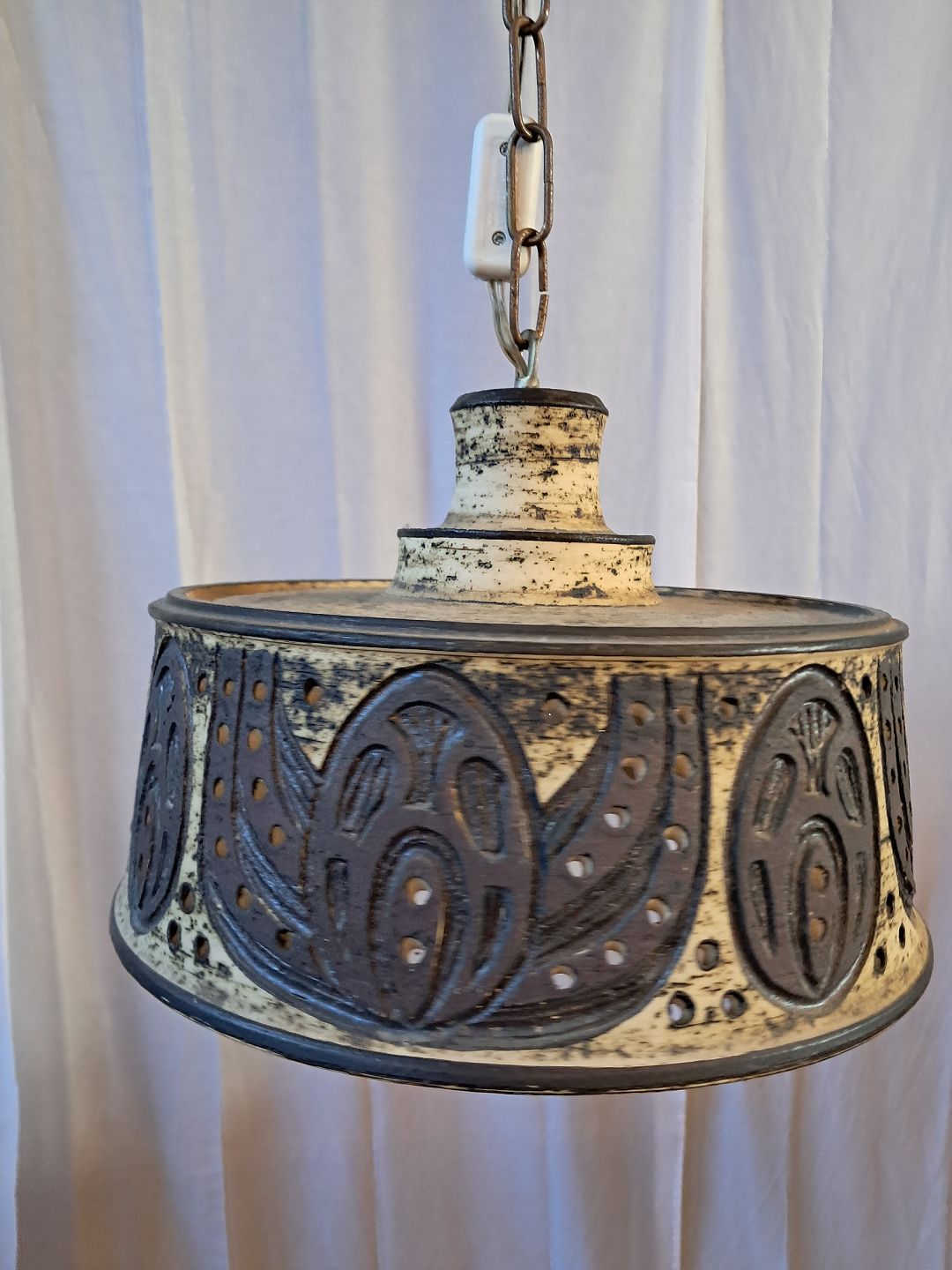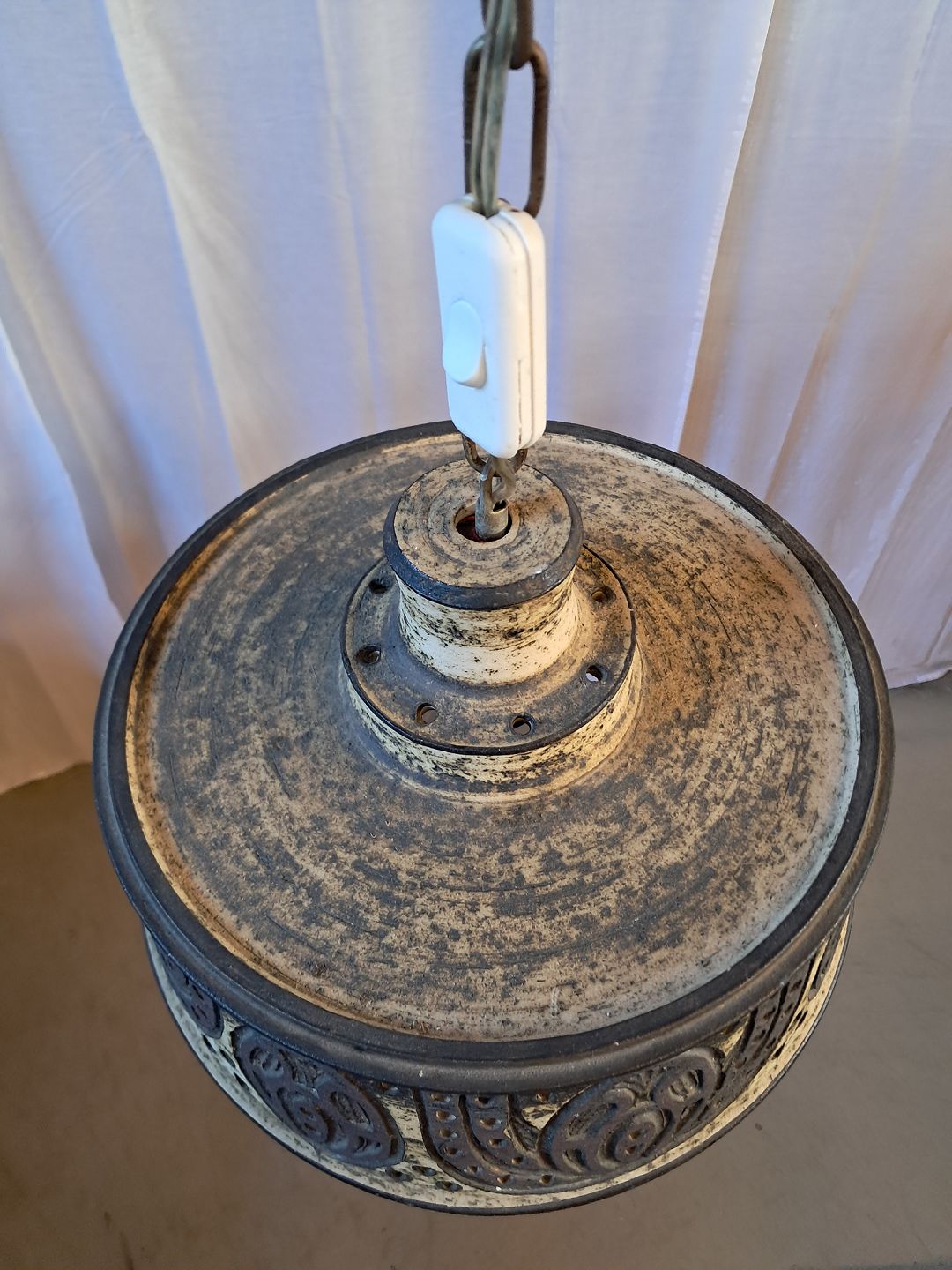Loftlampe i keramik med metalkæde, fra 1970erne.Højde 22cm Diameter 30cm