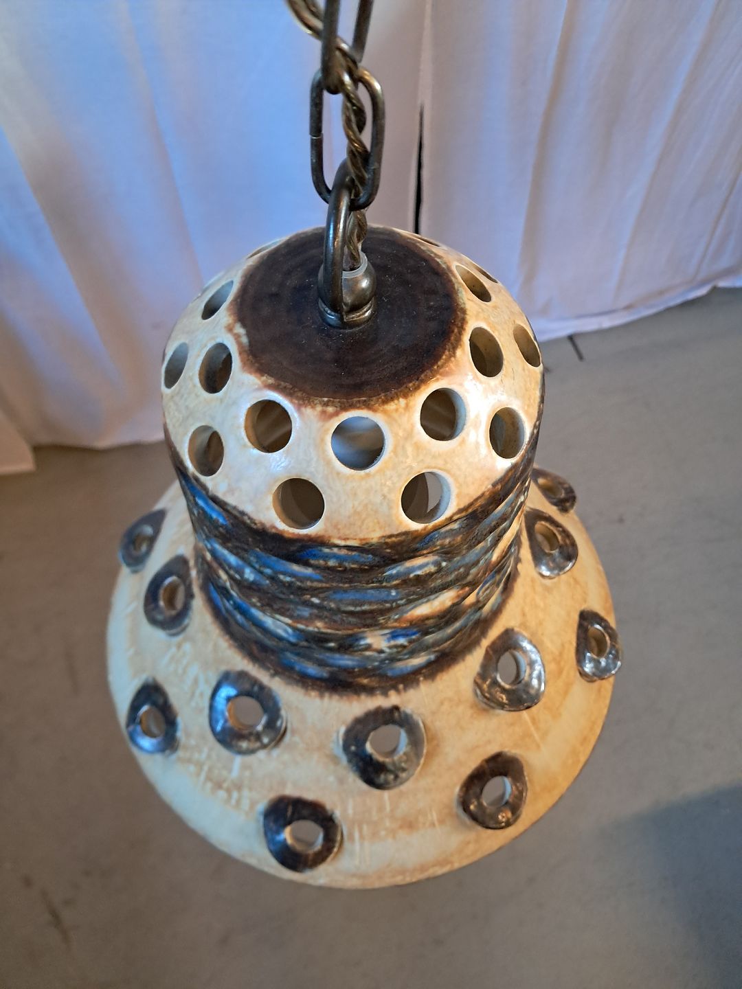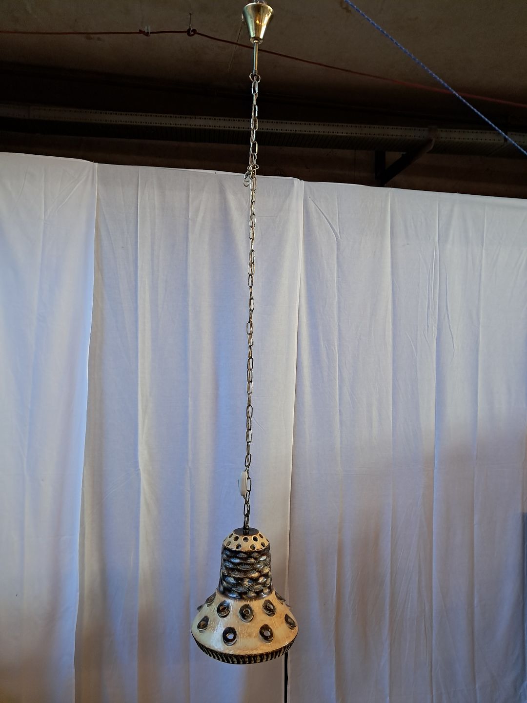 Loftlampe i keramik med metalkæde, fra 1970erne.Højde 28cm Diameter 25cm