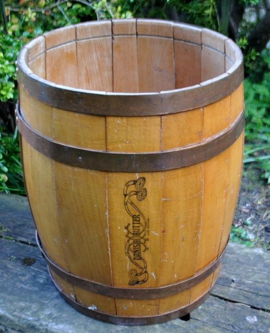 Old miniature butter can, 20th century. Denmark. Made with wooden sticks, polished beech wood. Rings in the shape of copper. On two of the sticks there is a stamp for Danish Lurpak. H. 34.5 cm. Dia.: 24 cm.Perfect condition!