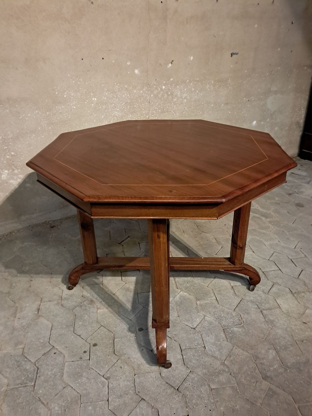 Salonbord med fineret mahogni bordplade og stolper af massivt fyrretræ.Det er fra 1910erne og har brugsspor.