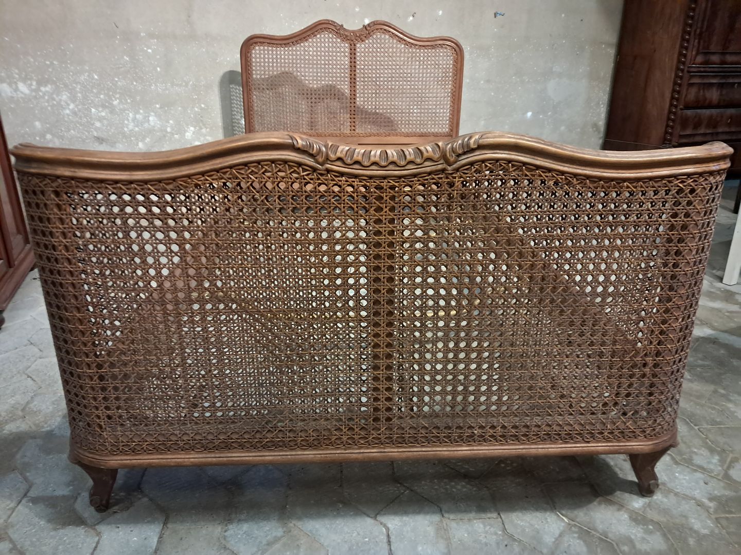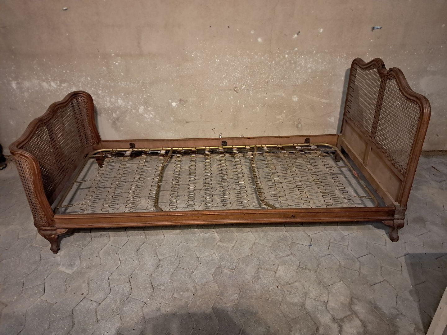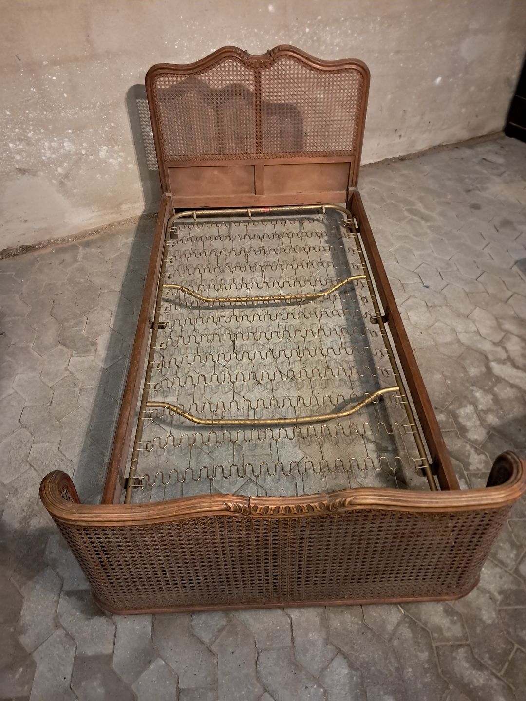 Seng i massivt bøgetræ med rørflet, fra 1950erne.Den har brugsspor og der medfølger ikke madras.