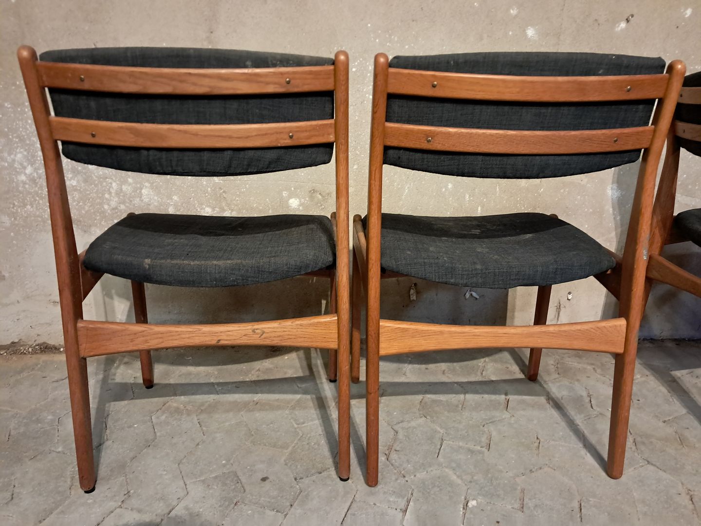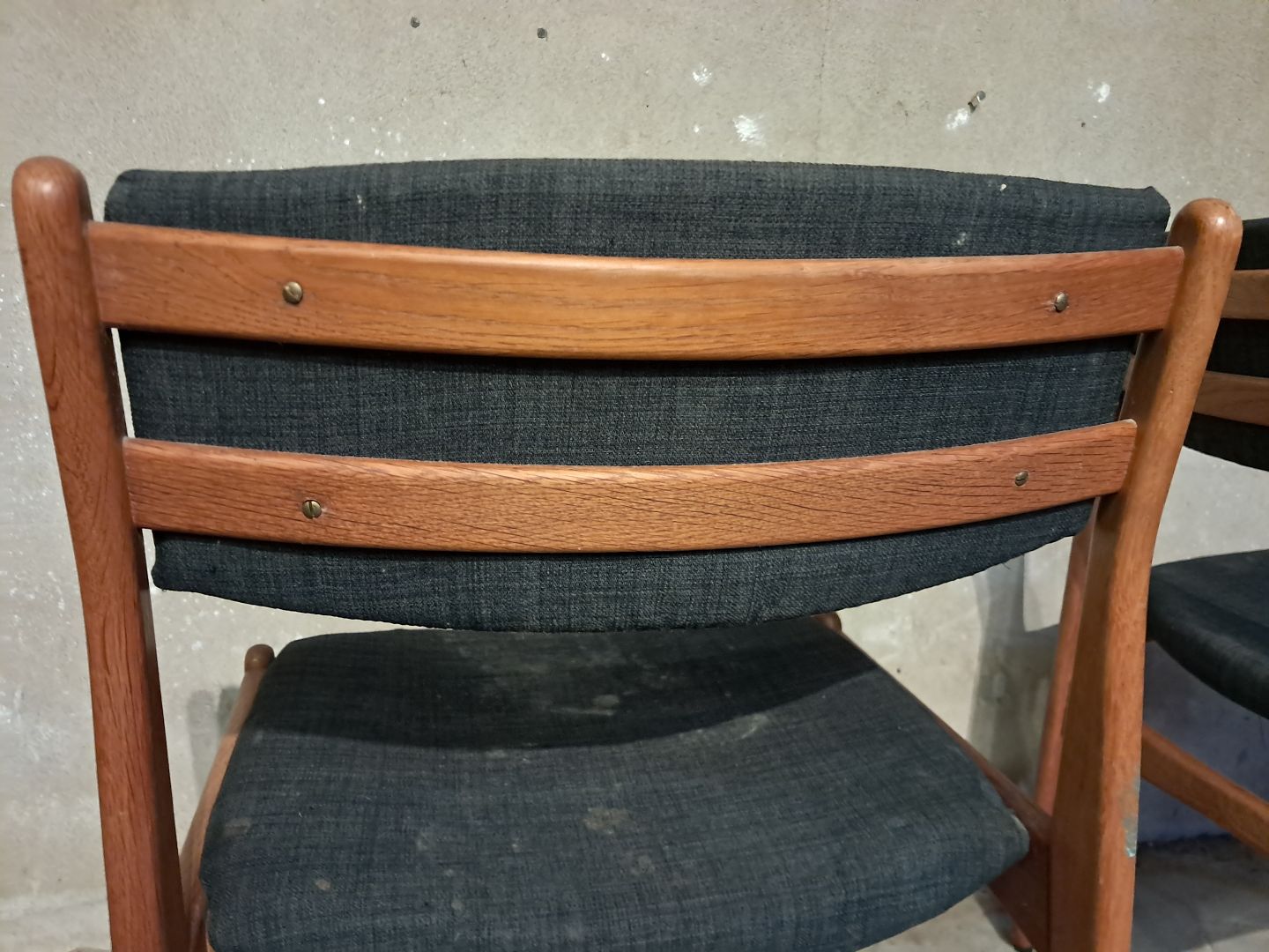 4 Stole i massivt egetræ, fra 1960erne.Betrækket trænger til at blive skiftet.