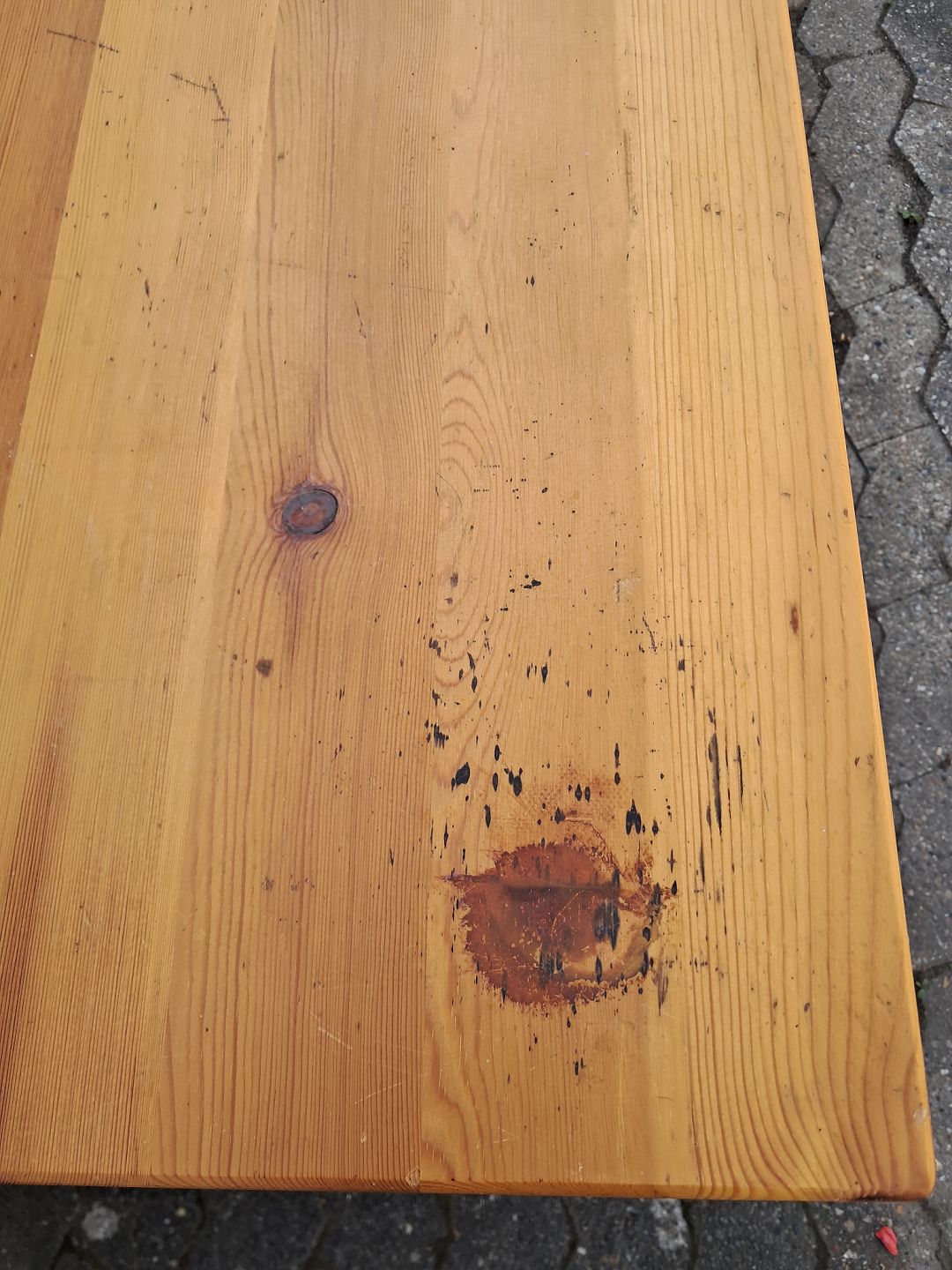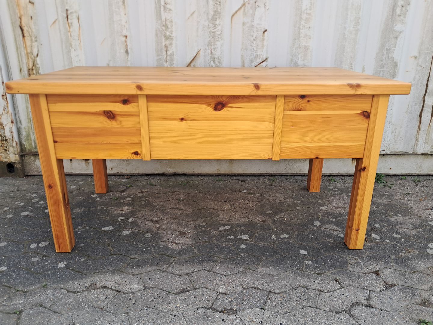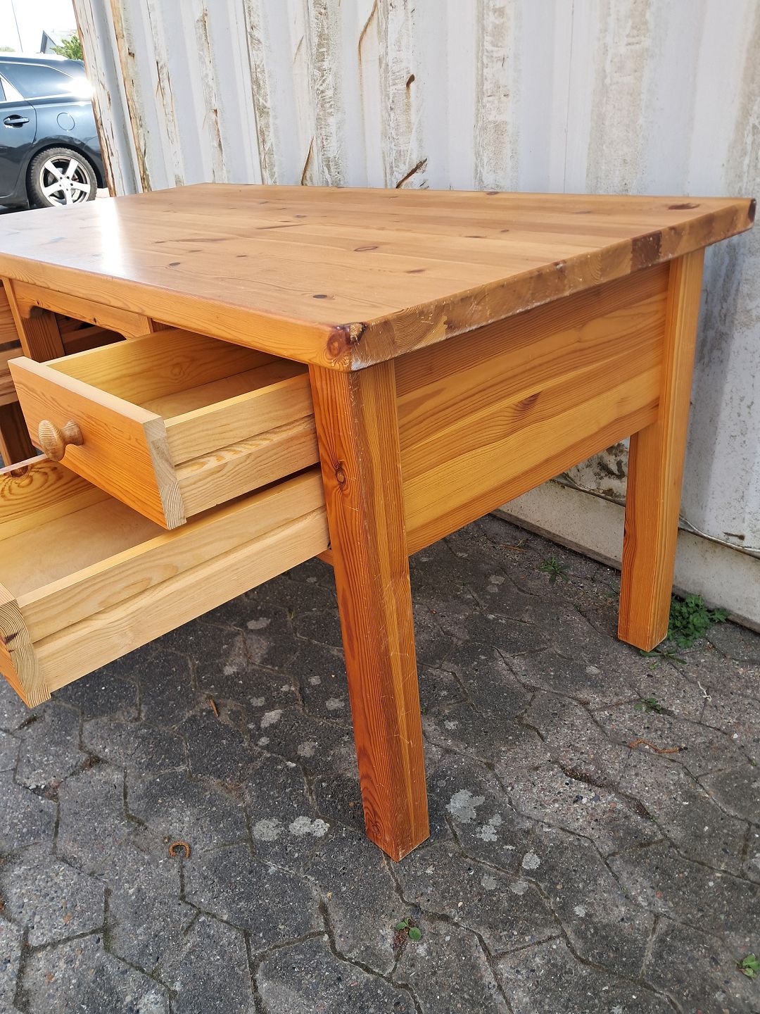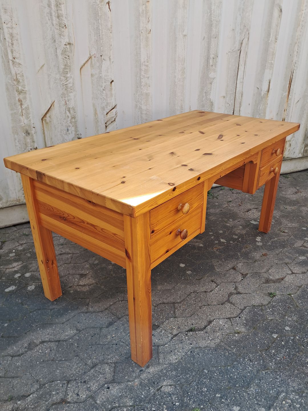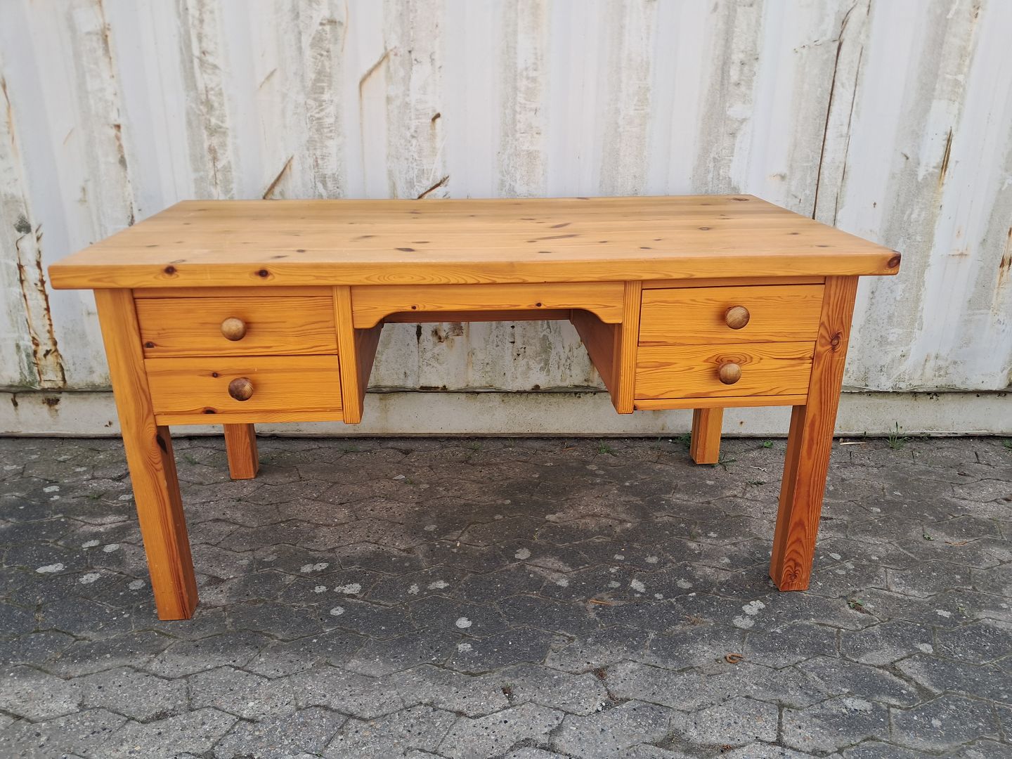 Skrivebord i massivt fyrretræ, fra 1980erne.Det har brugsspor.