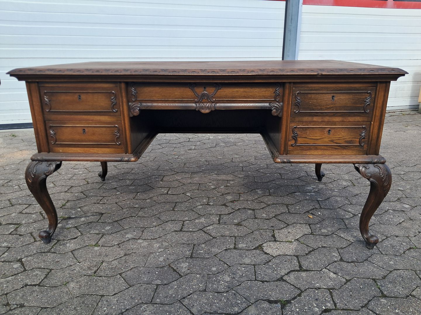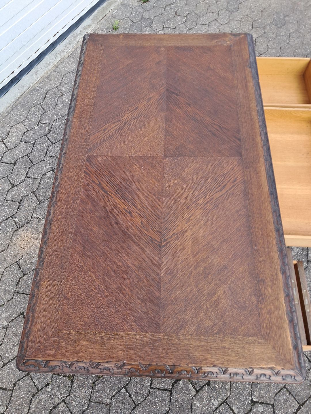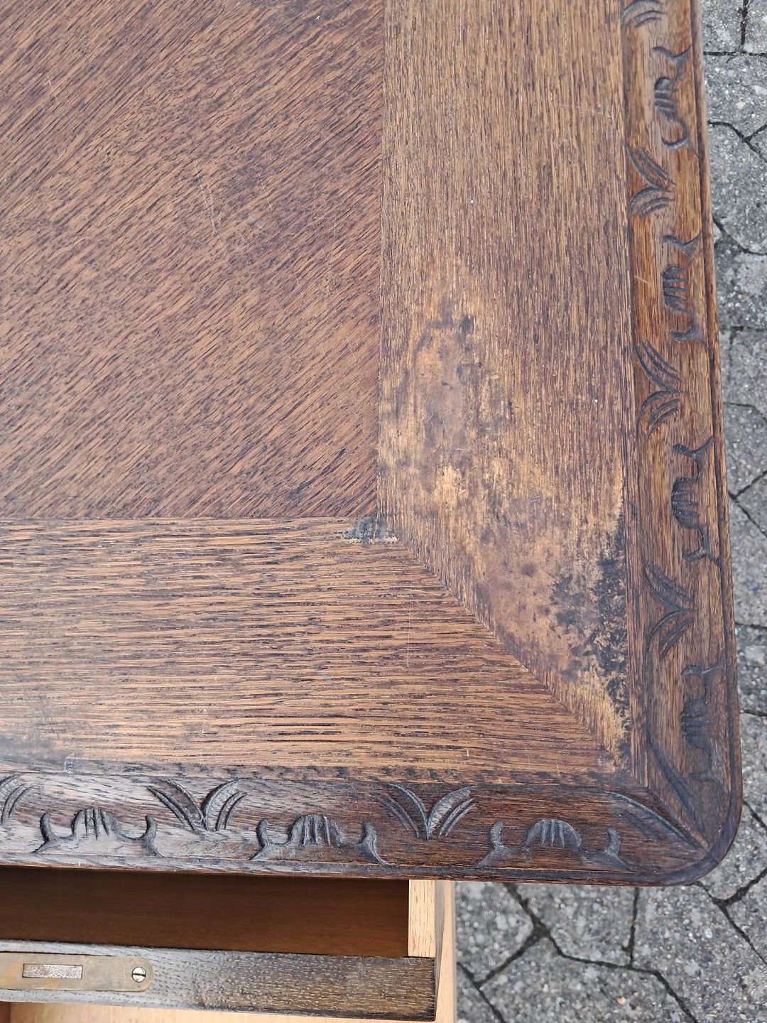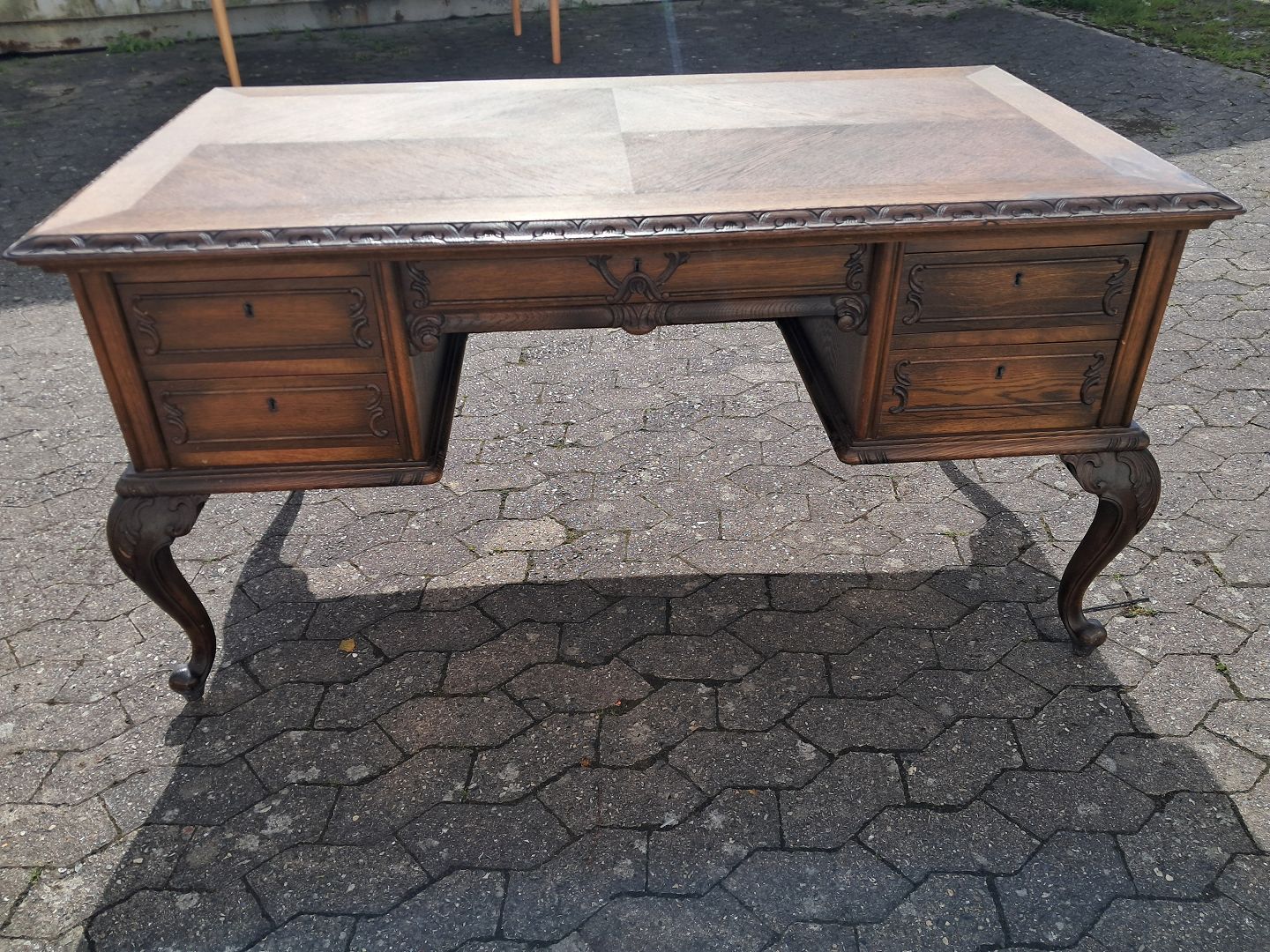 Skrivebord i fineret egetræ, fra 1950erne.Det har brugsspor.