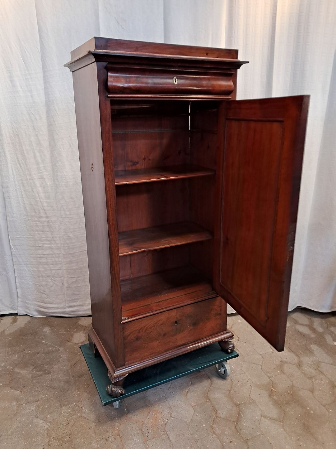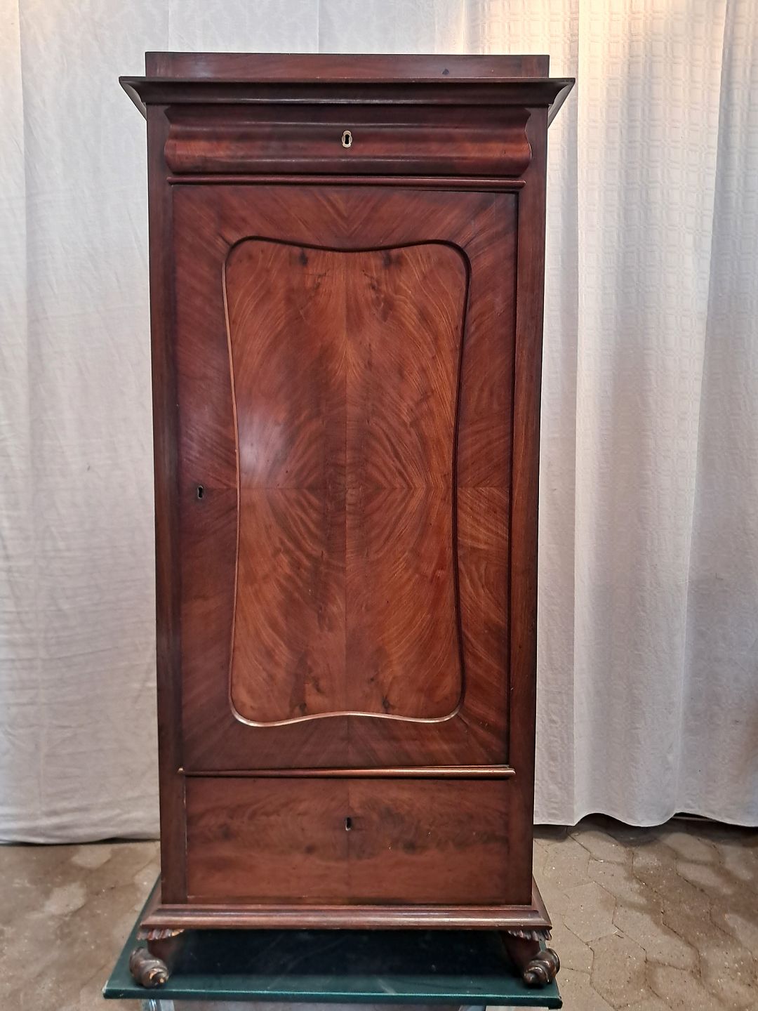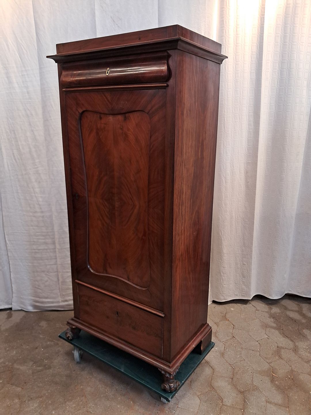 Skab i fineret mahogni, fra 1900erne.Det har brugsspor og en defekt på hjørnet.