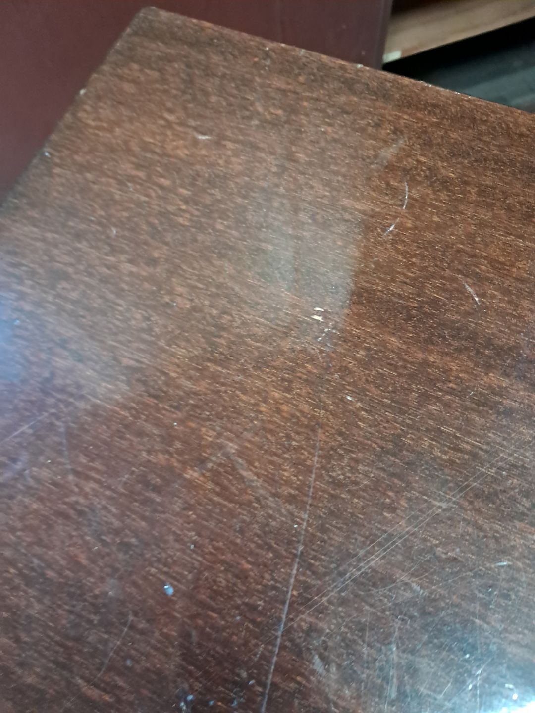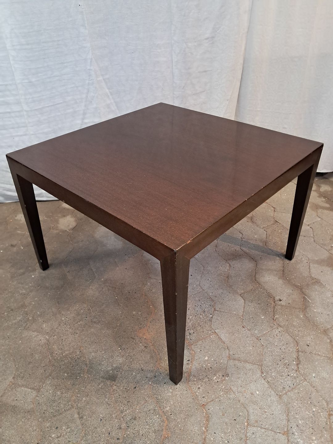 Kvadratisk Haslev sofabord i fineret mahogni, fra 1980erne.Det har en del bruggspor/ridser.