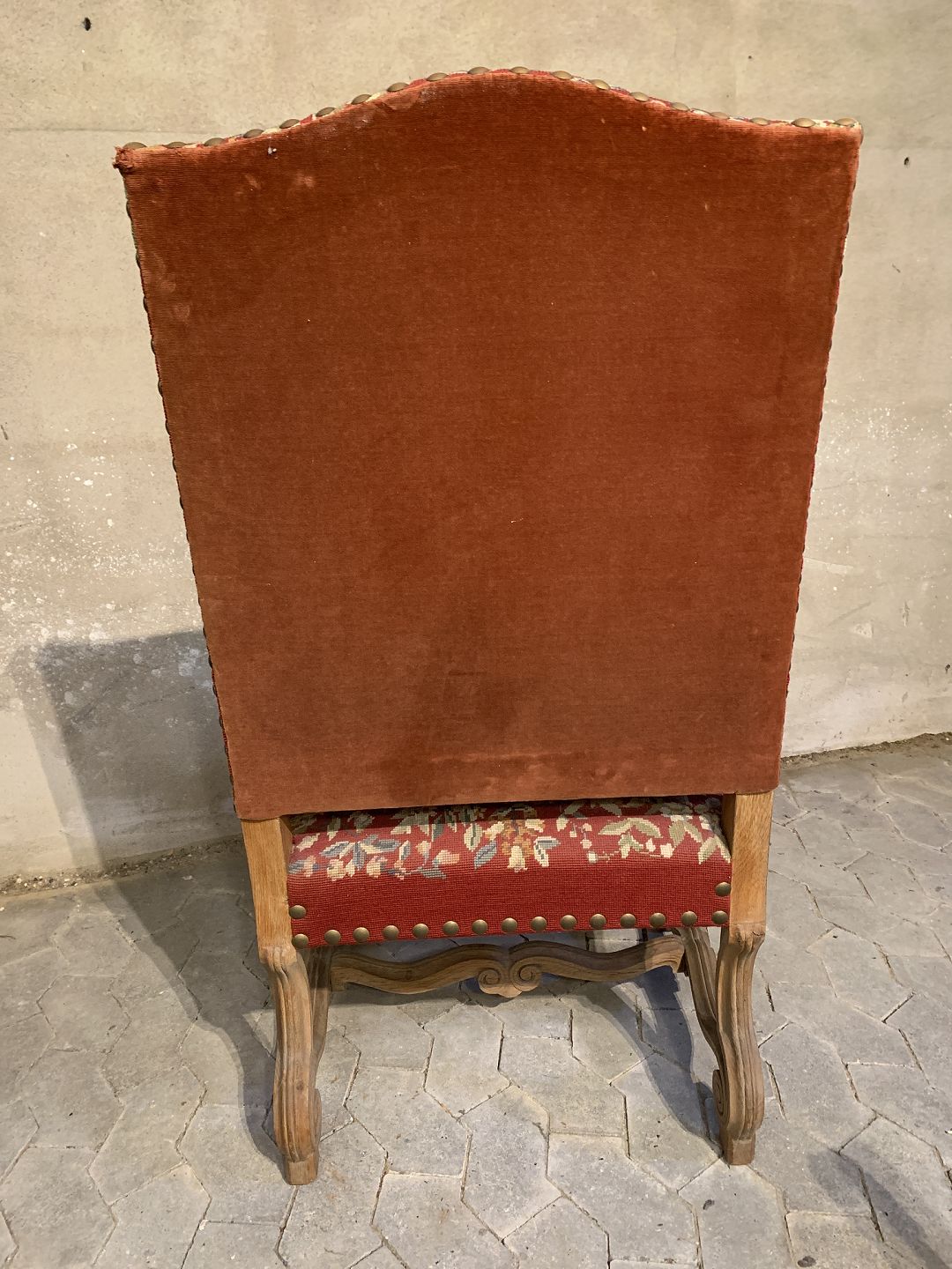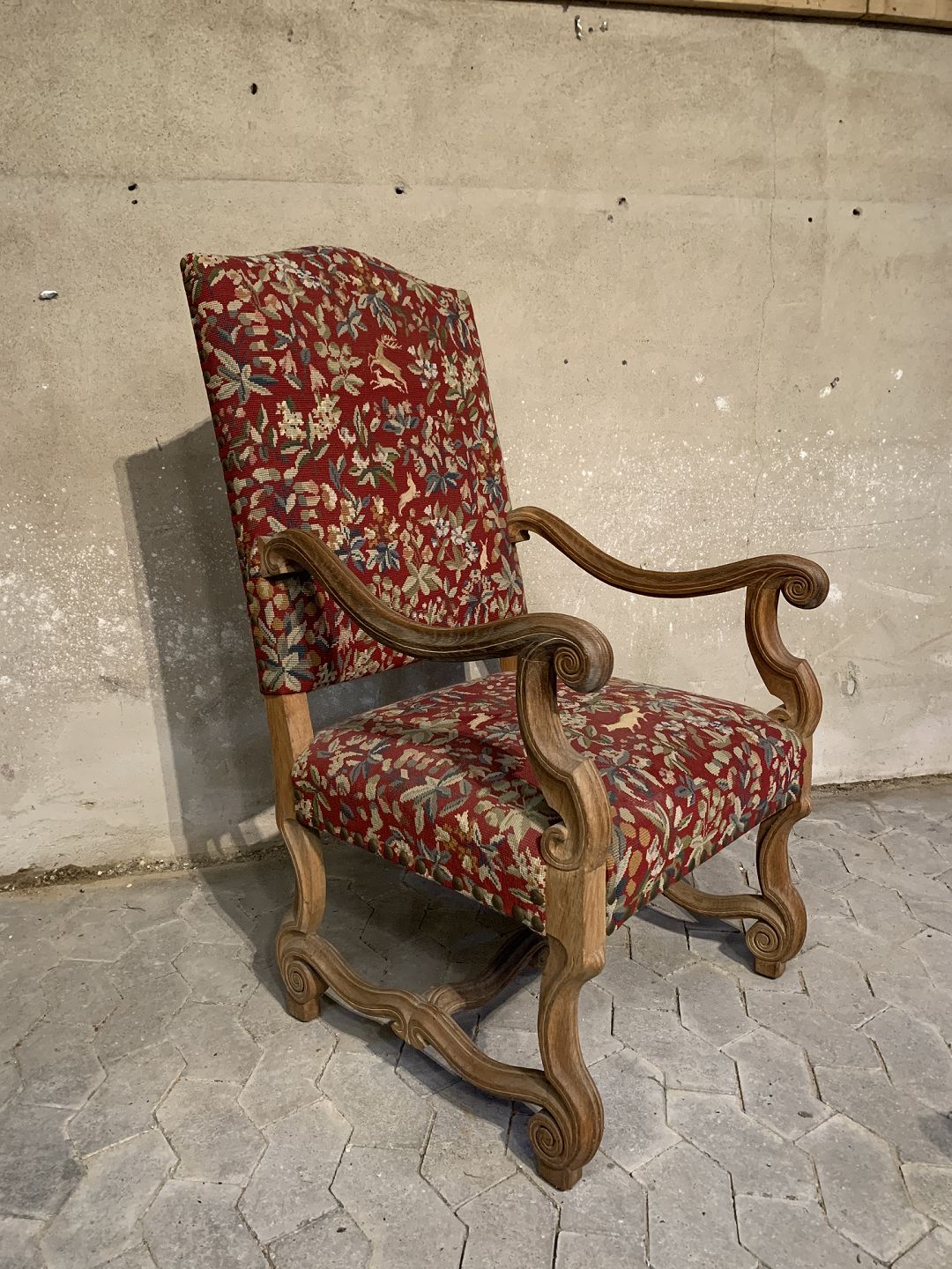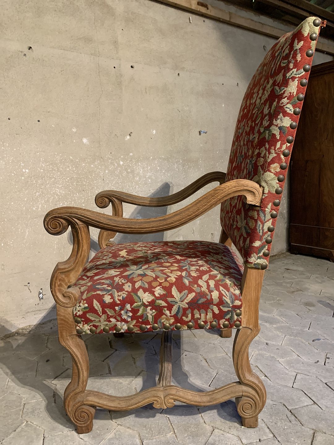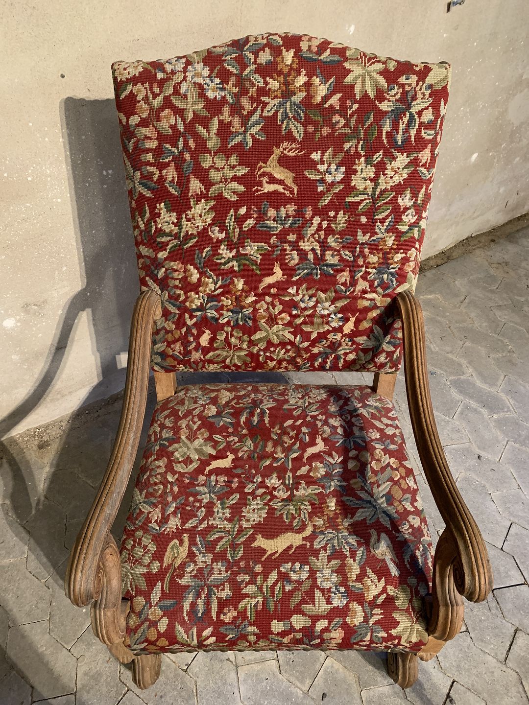 Armstol i massivt egetræ med broderet betræk, fra 1930erne.Den har brugsspor.