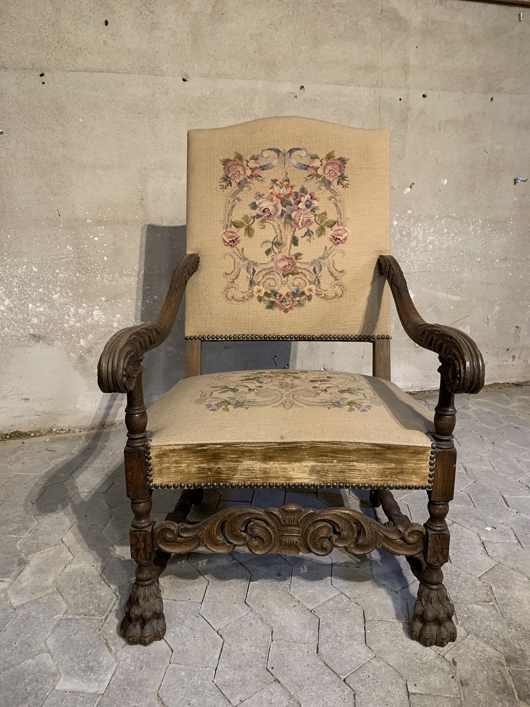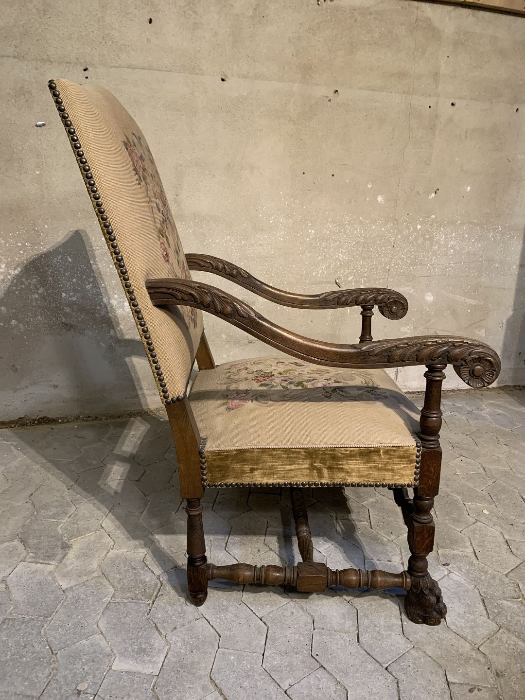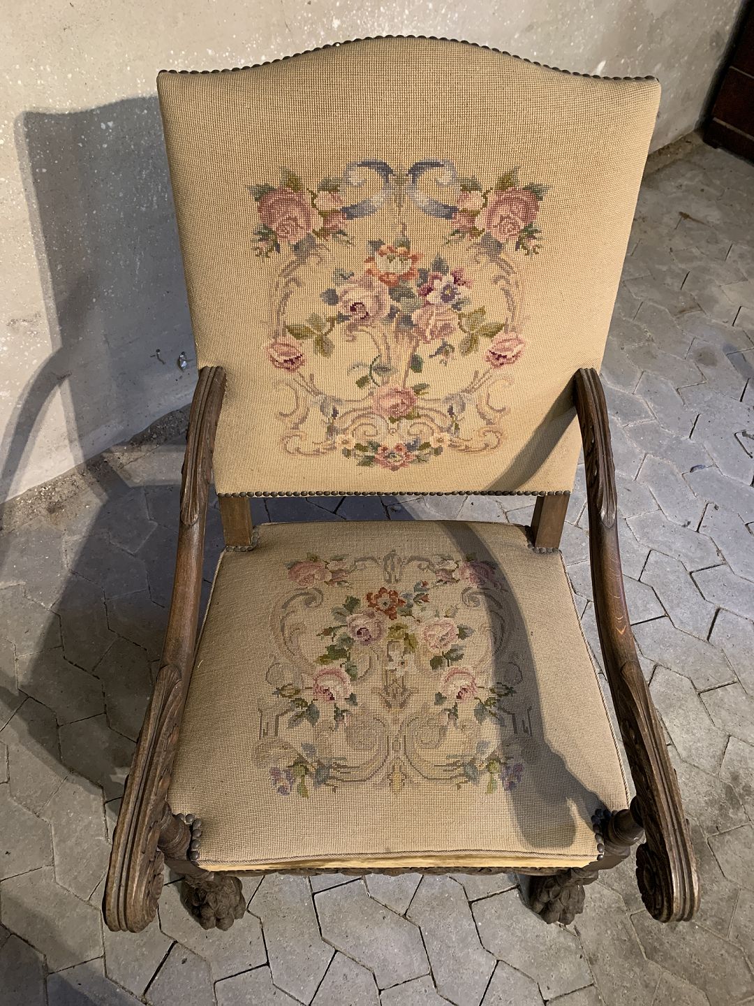 Armstol i massivt egetræ med broderet betræk, fra 1930erne.Den har brugsspor.