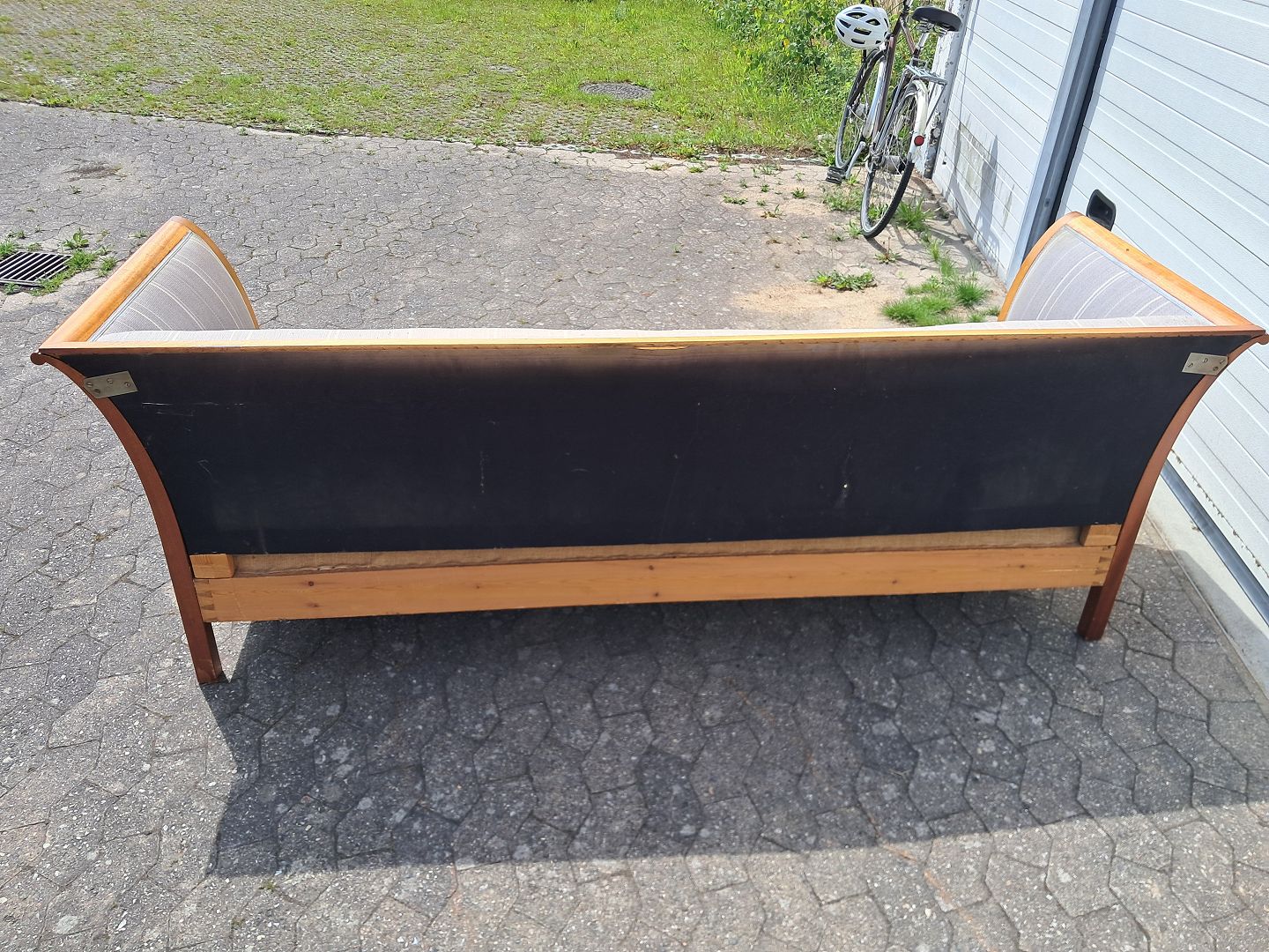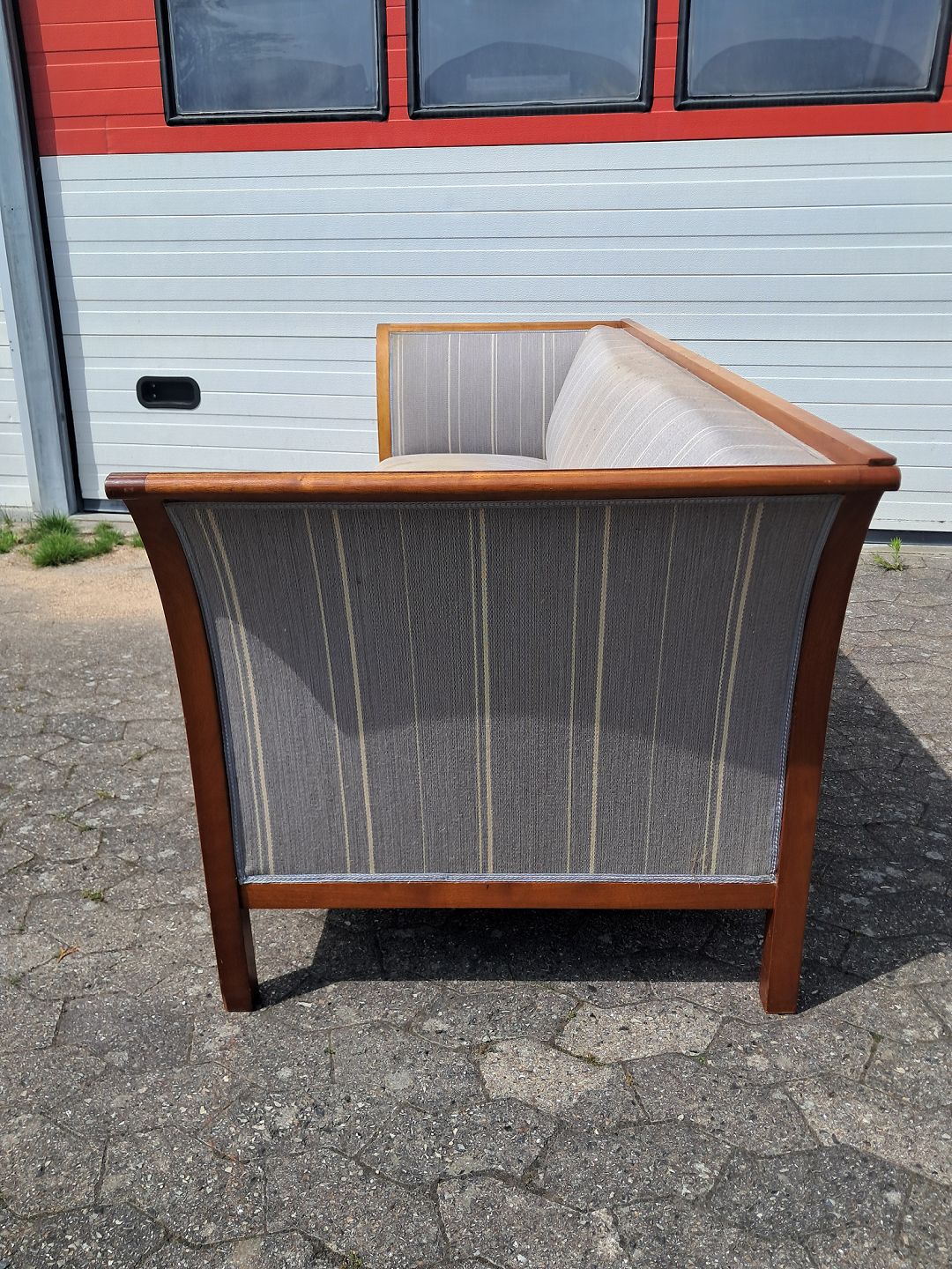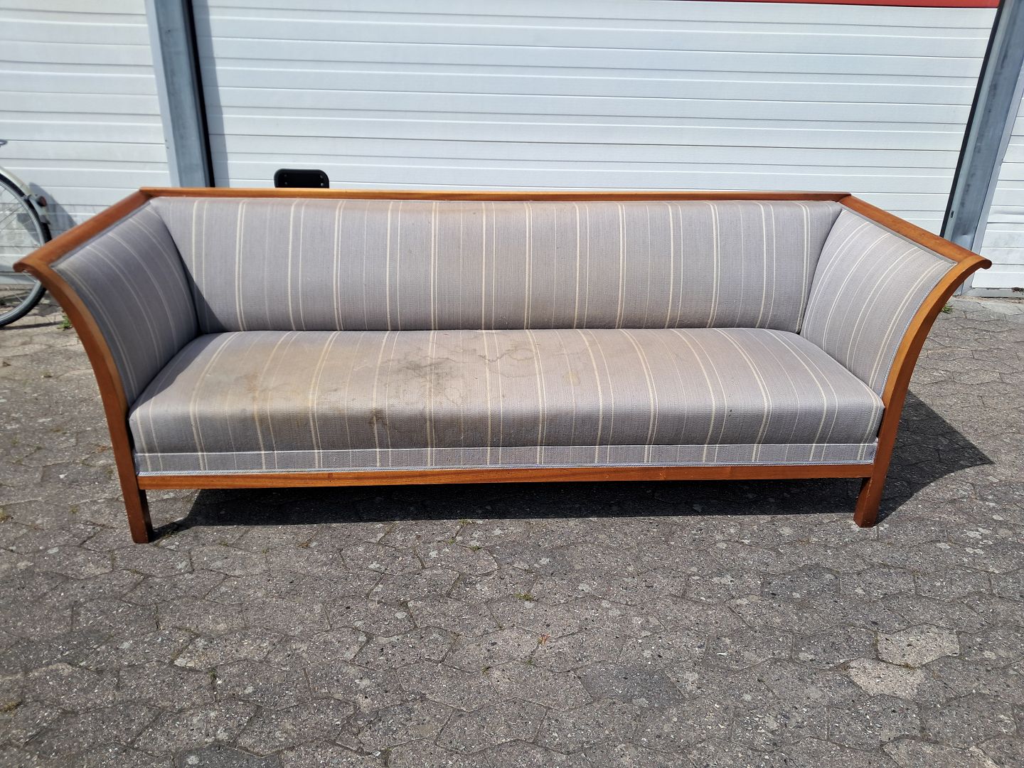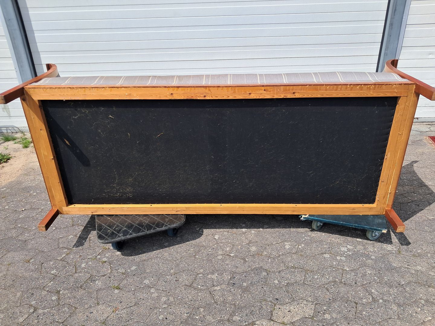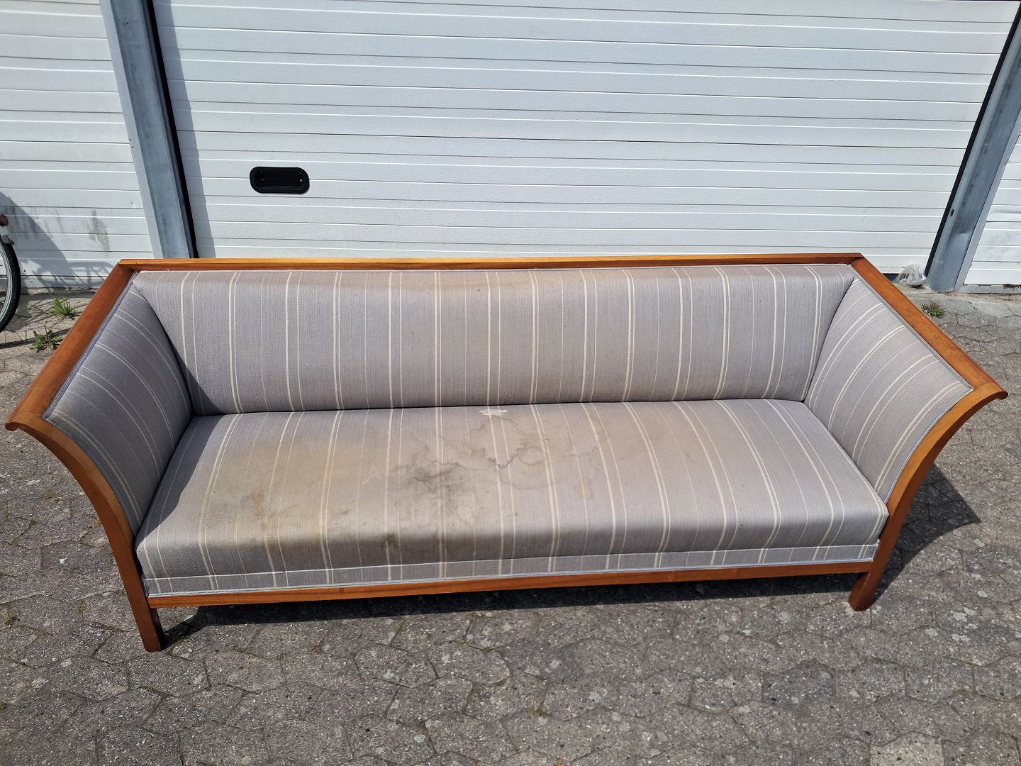 Sofa i mahogni, fra 1950erne.Betrækket har en del brugsspor.