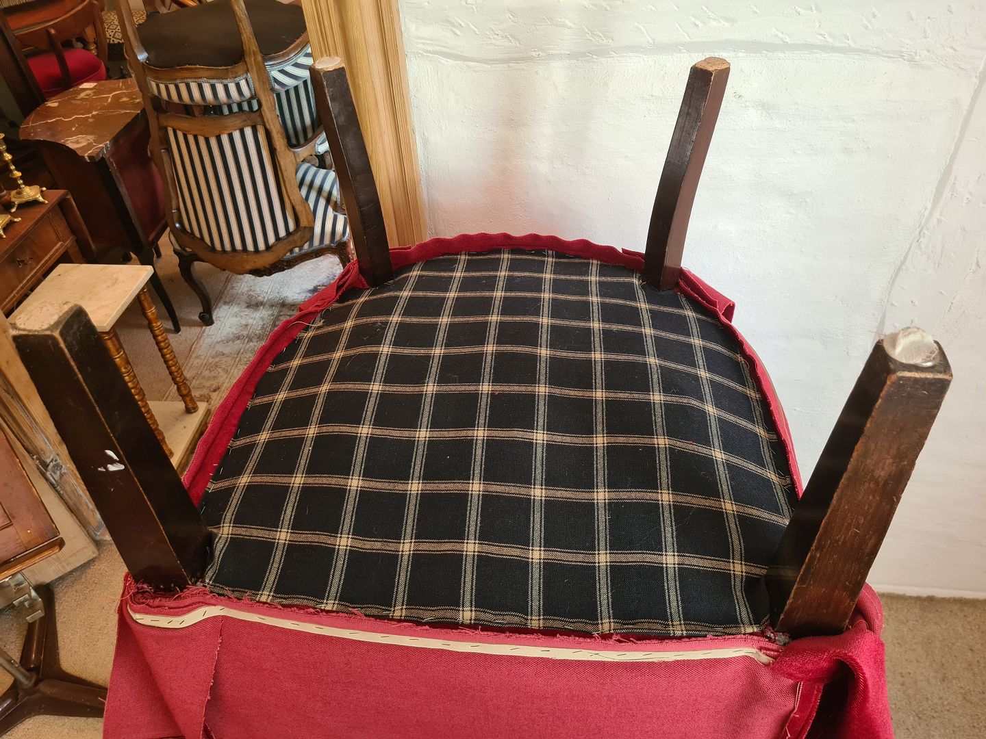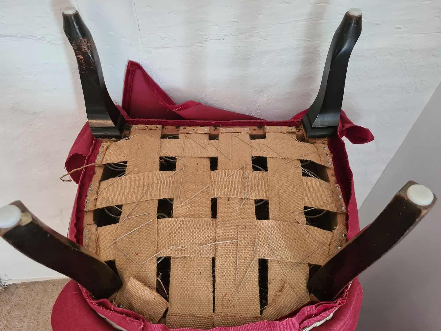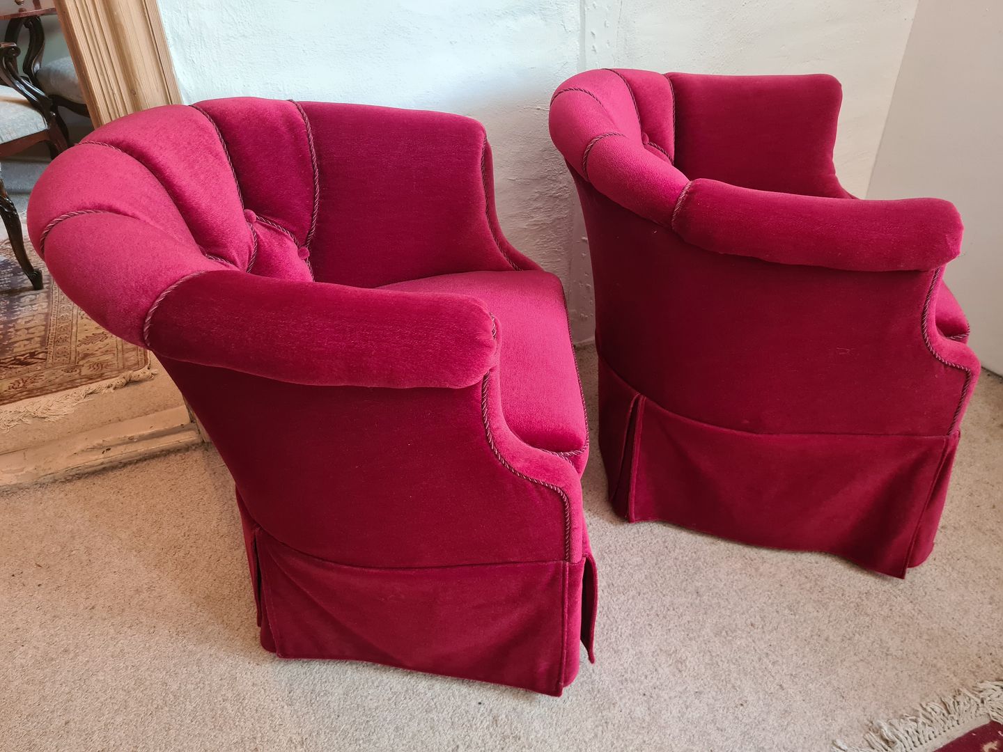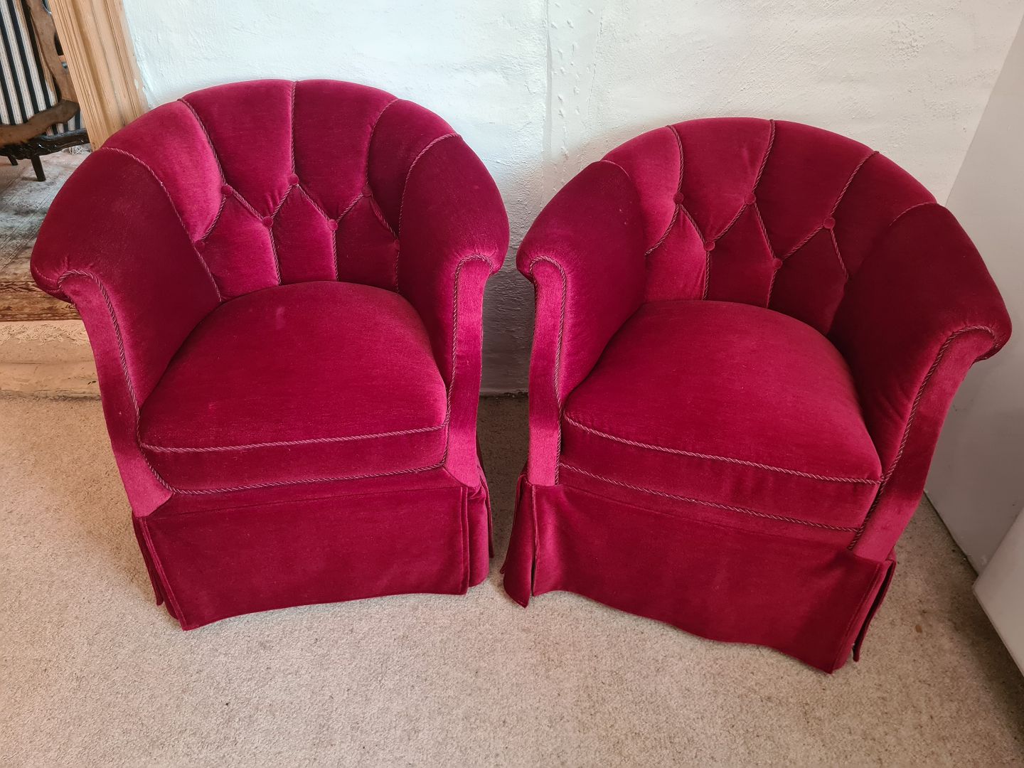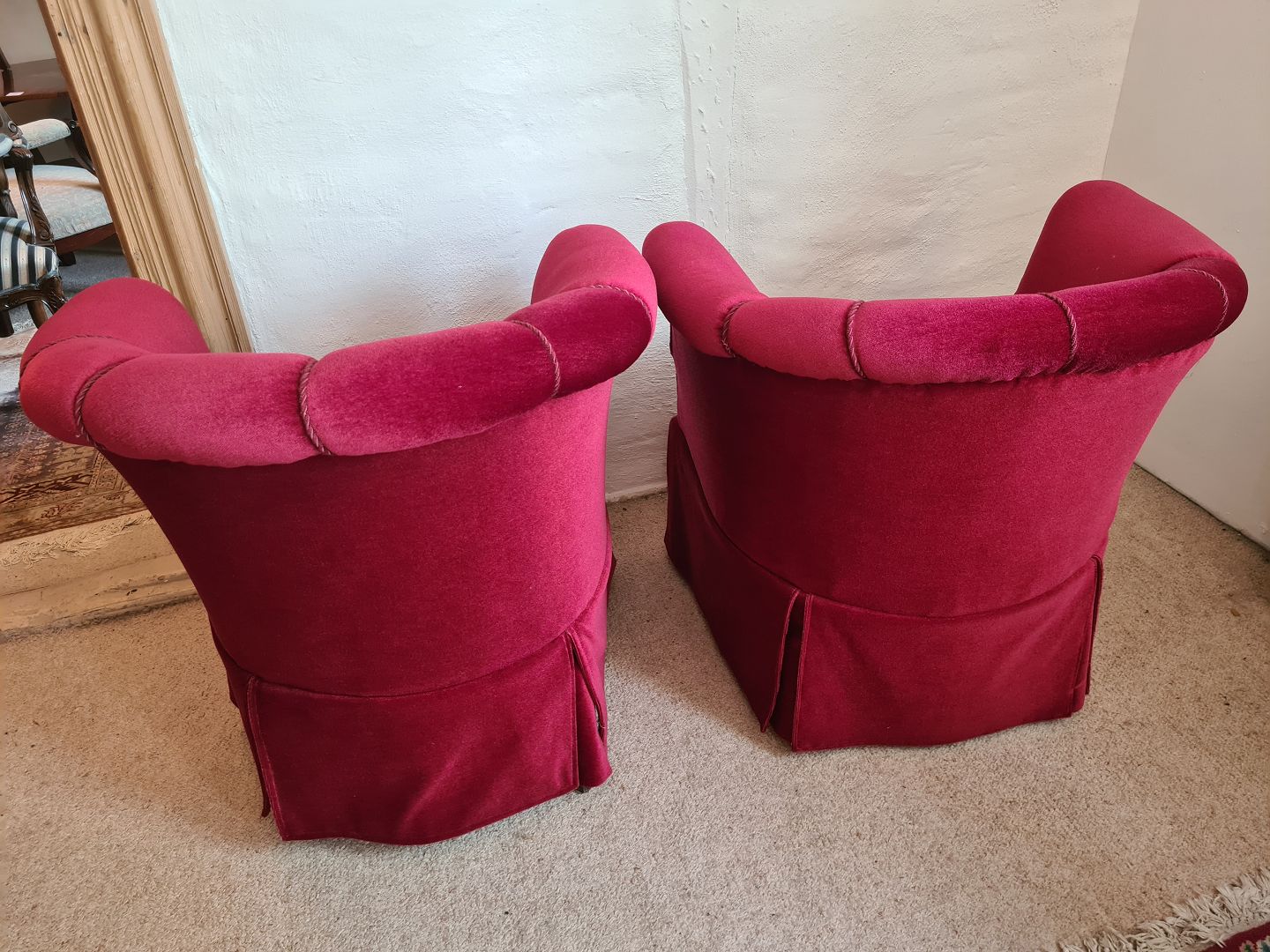 Par lænestole fra 1950'erne overbetrukket med rødt velour. Fremstår pæne og velholdte uden nævneværdige brugsspor. Højde 78 cm. Bredde 73 cm. Dybde 68 cm.