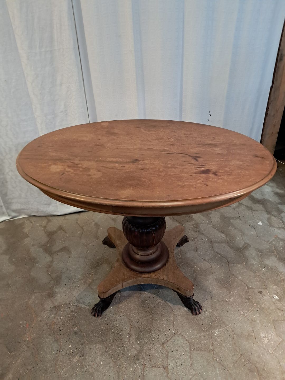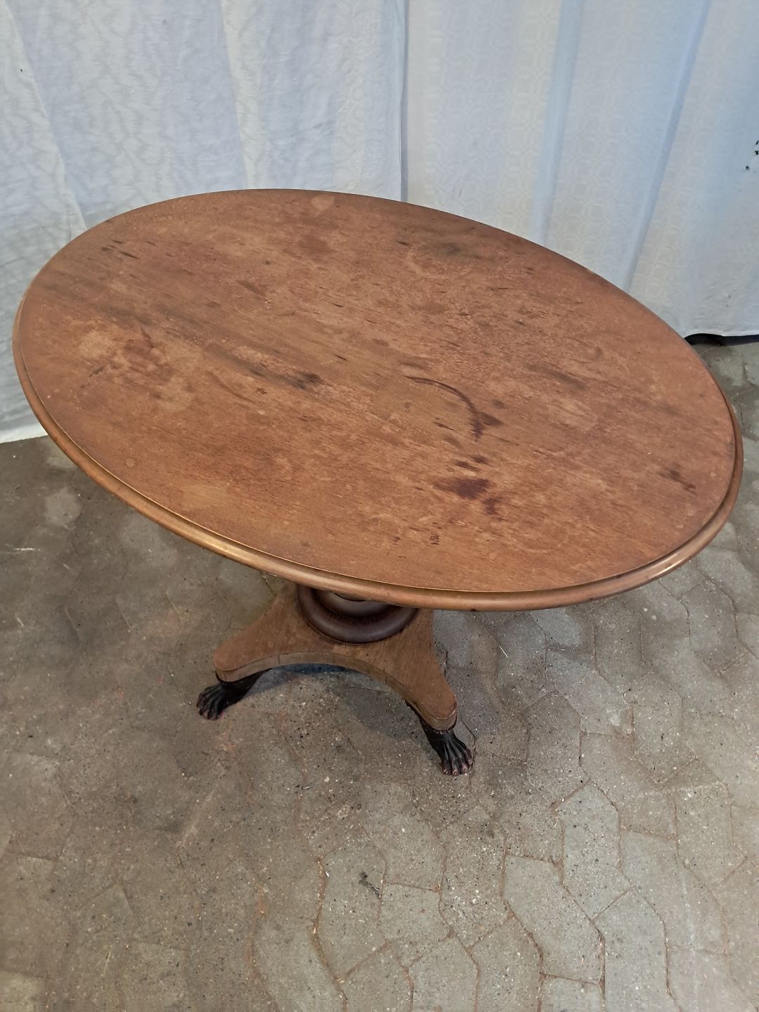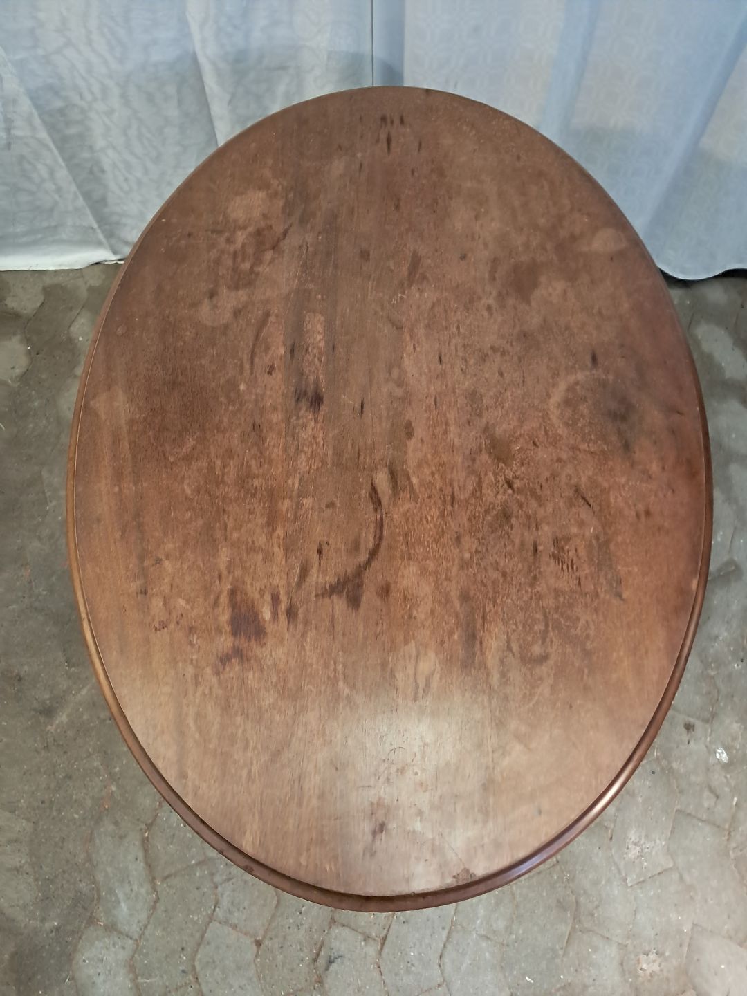 Ovalt salonbord i massivt mahogni, fra 1910erne.Det har brugsspor og en reven i træet. (se foto)