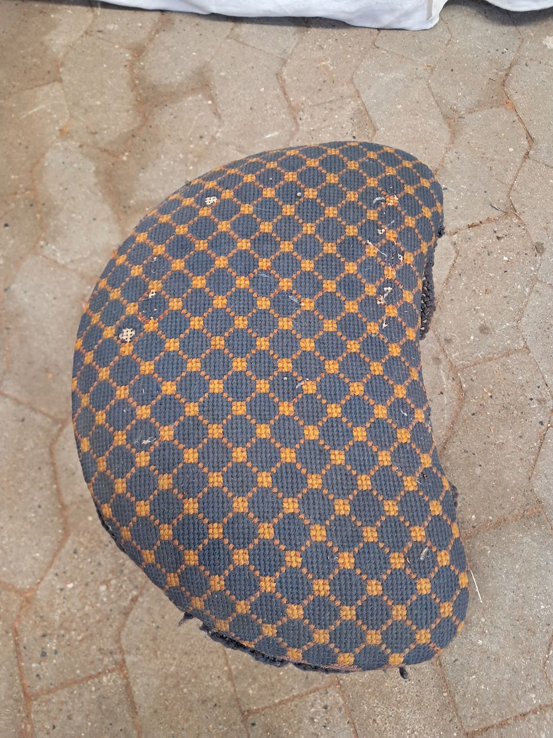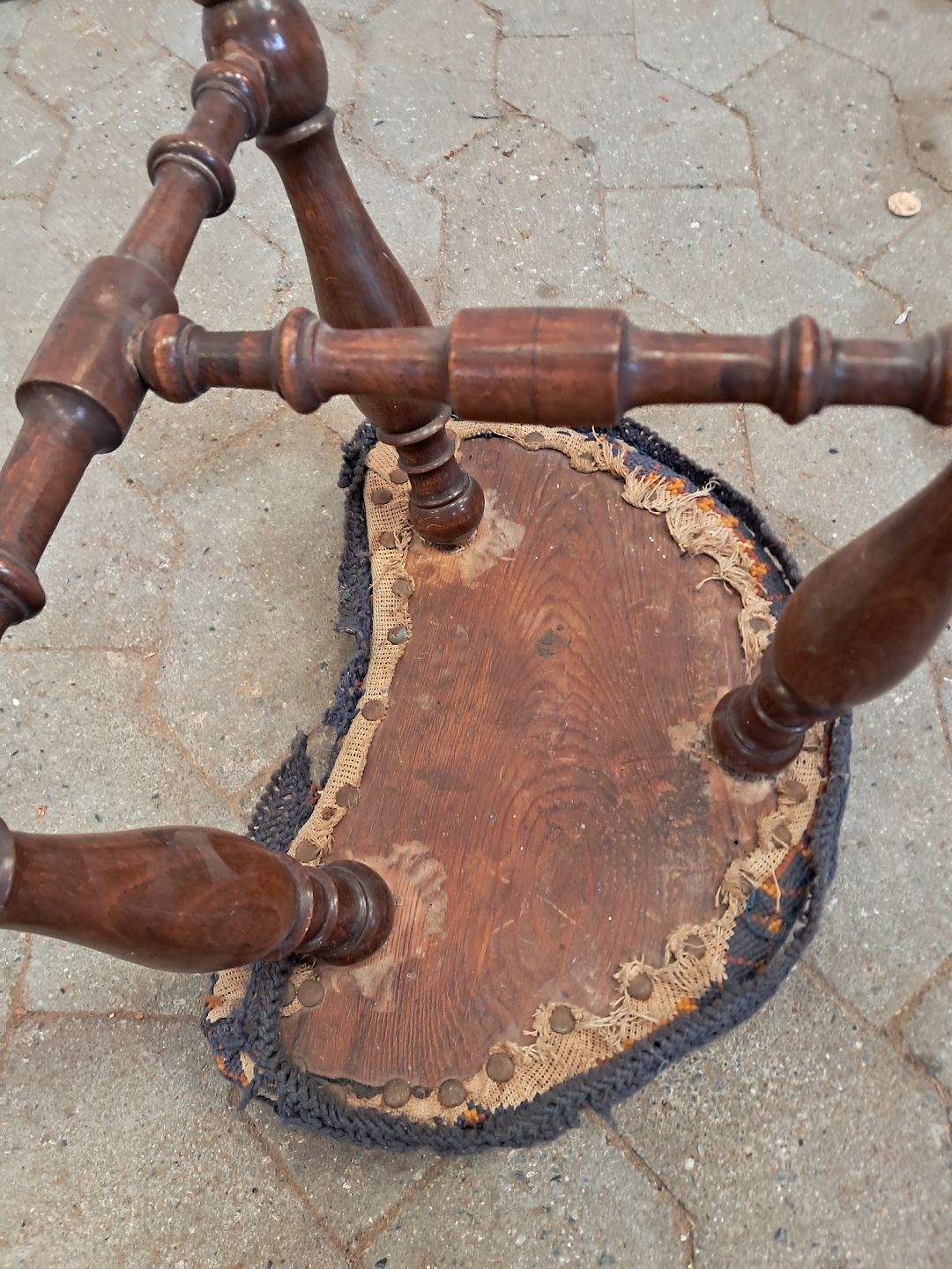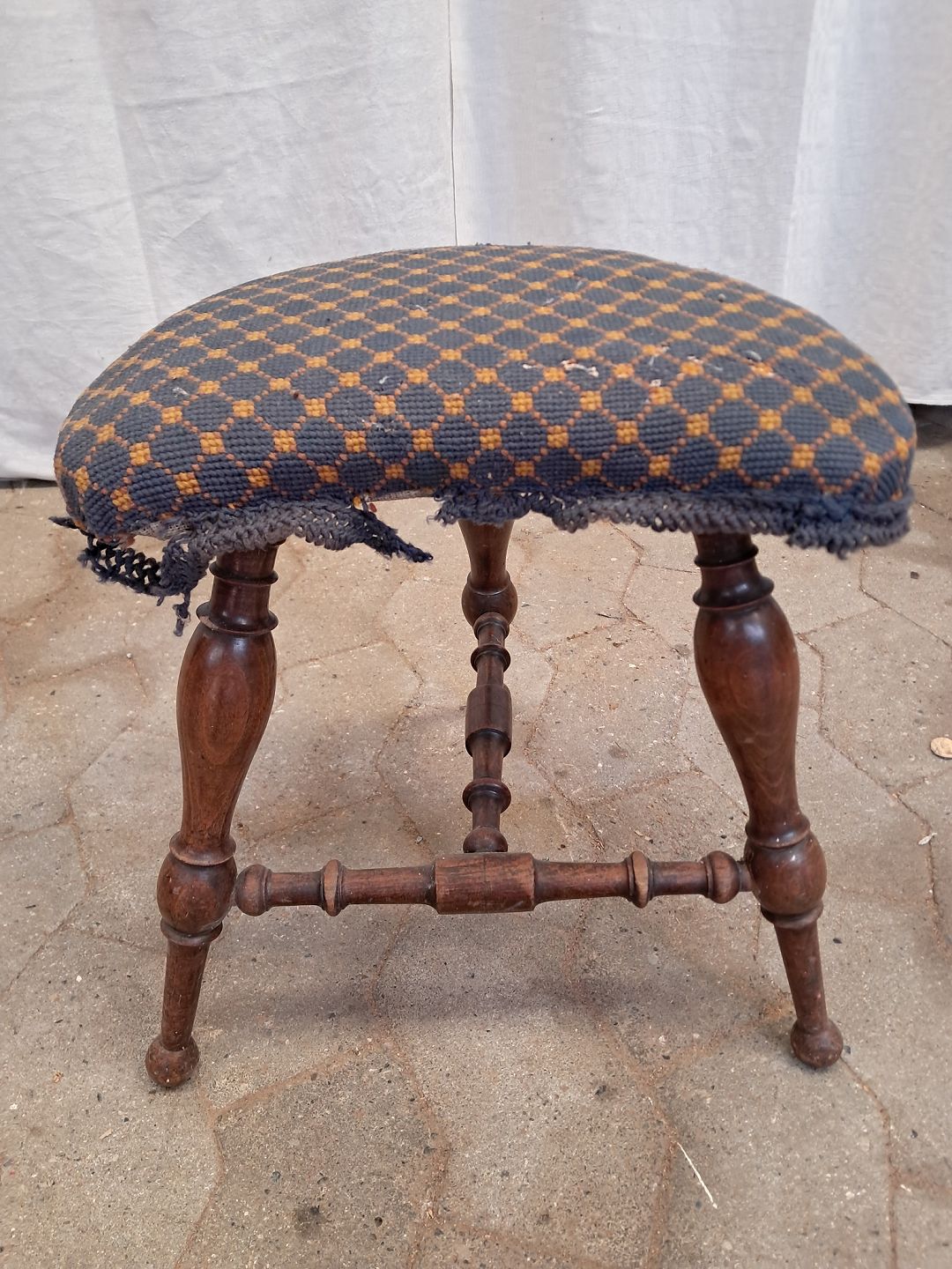 Skammel i massivt mahogni, fra 1900erne.Betrækket er defekt.