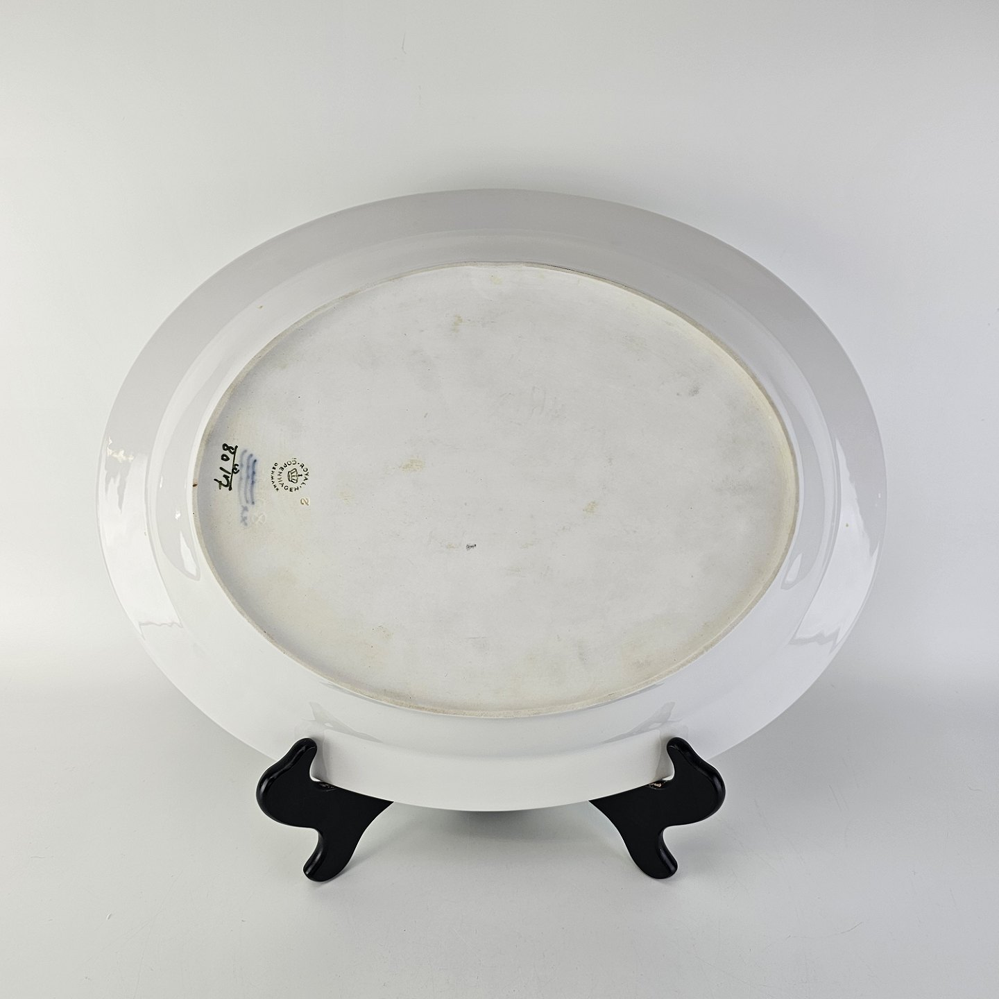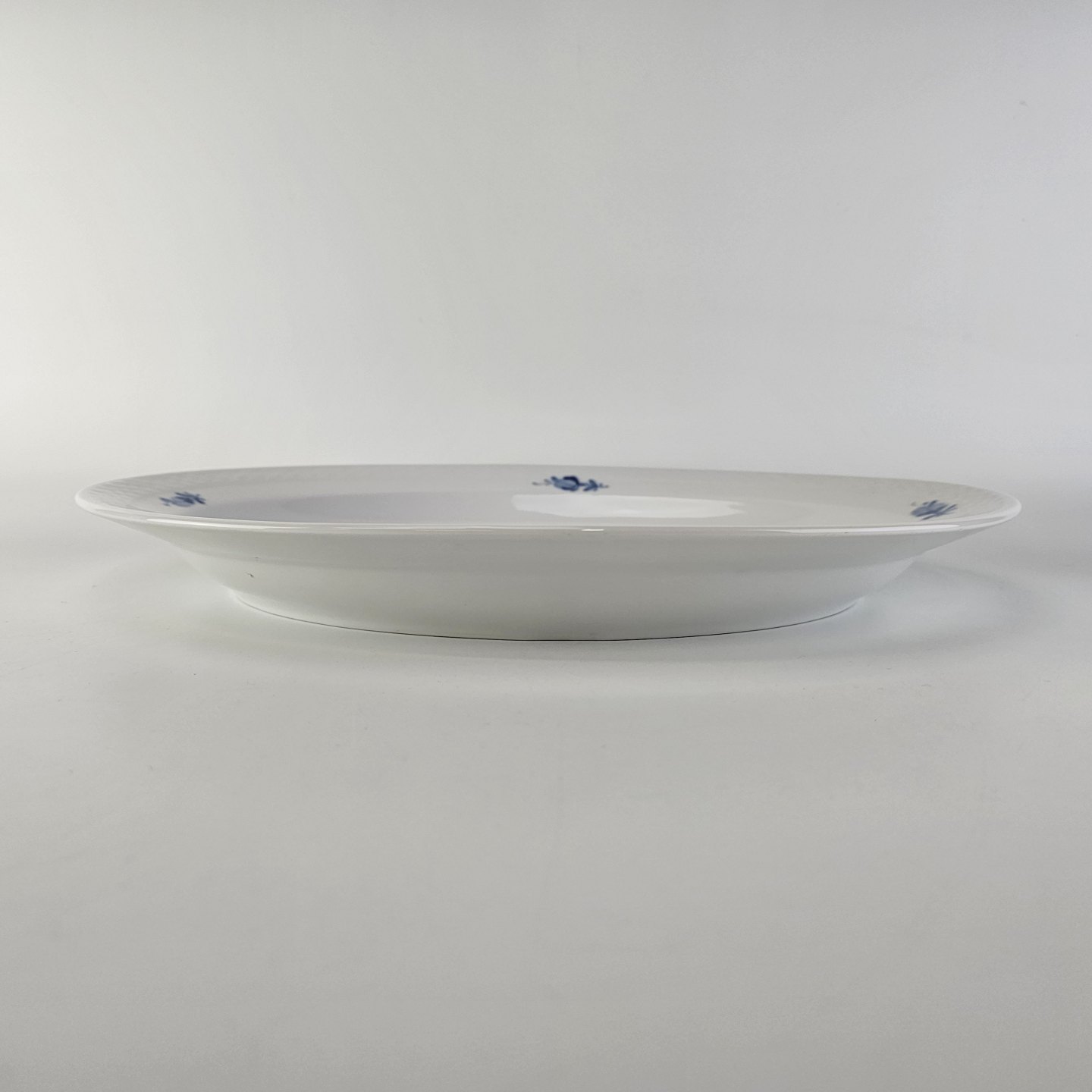 Ovalt fad i hvidt porcelæn dekoreret med blå blomster og flettet kant