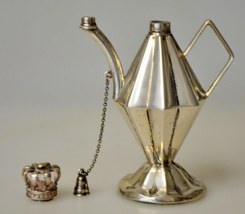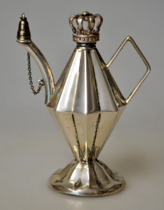 Hugo Grün small oil lamp in silver, 20th century. Copenhagen, Denmark. Stamped: 835S H.Gr. With lid in the shape of a royal crown. With handle and spout. On a filled foot. H. 9 cm.Item number: 27935