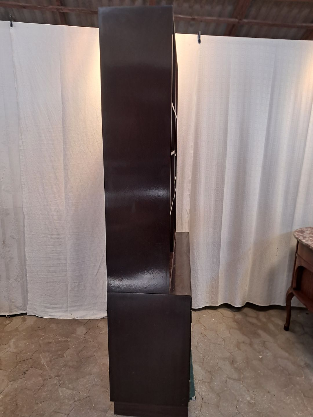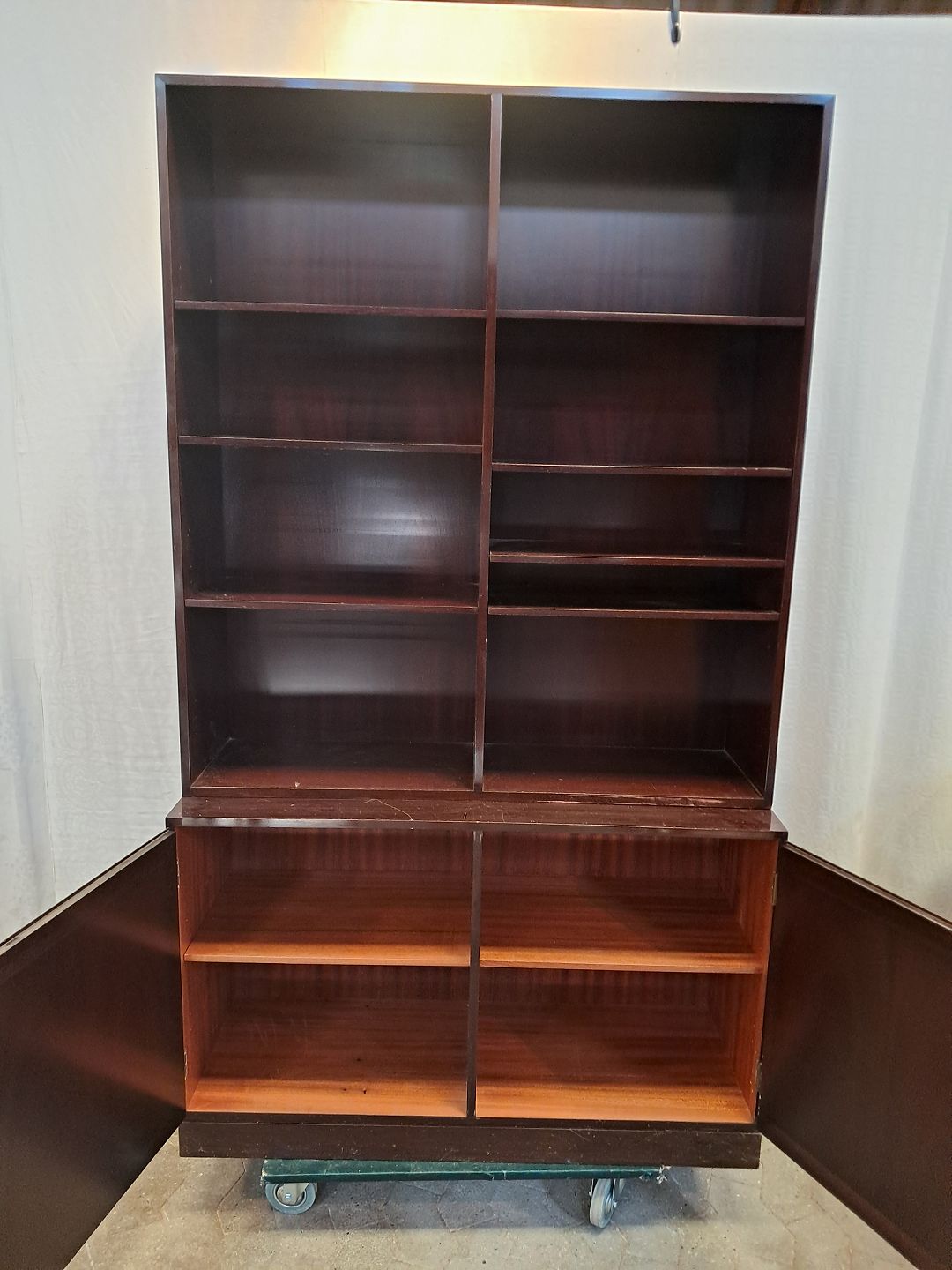 Reolsektion i fineret mahogni, fra 1970erne.Den har brugsspor.