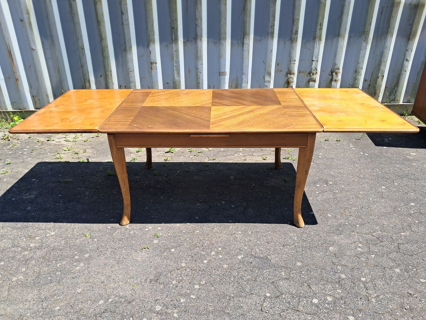 Spisebord i fineret mahogni med hollandsk udtræk, fra 1960erne.Det har brugsspor.