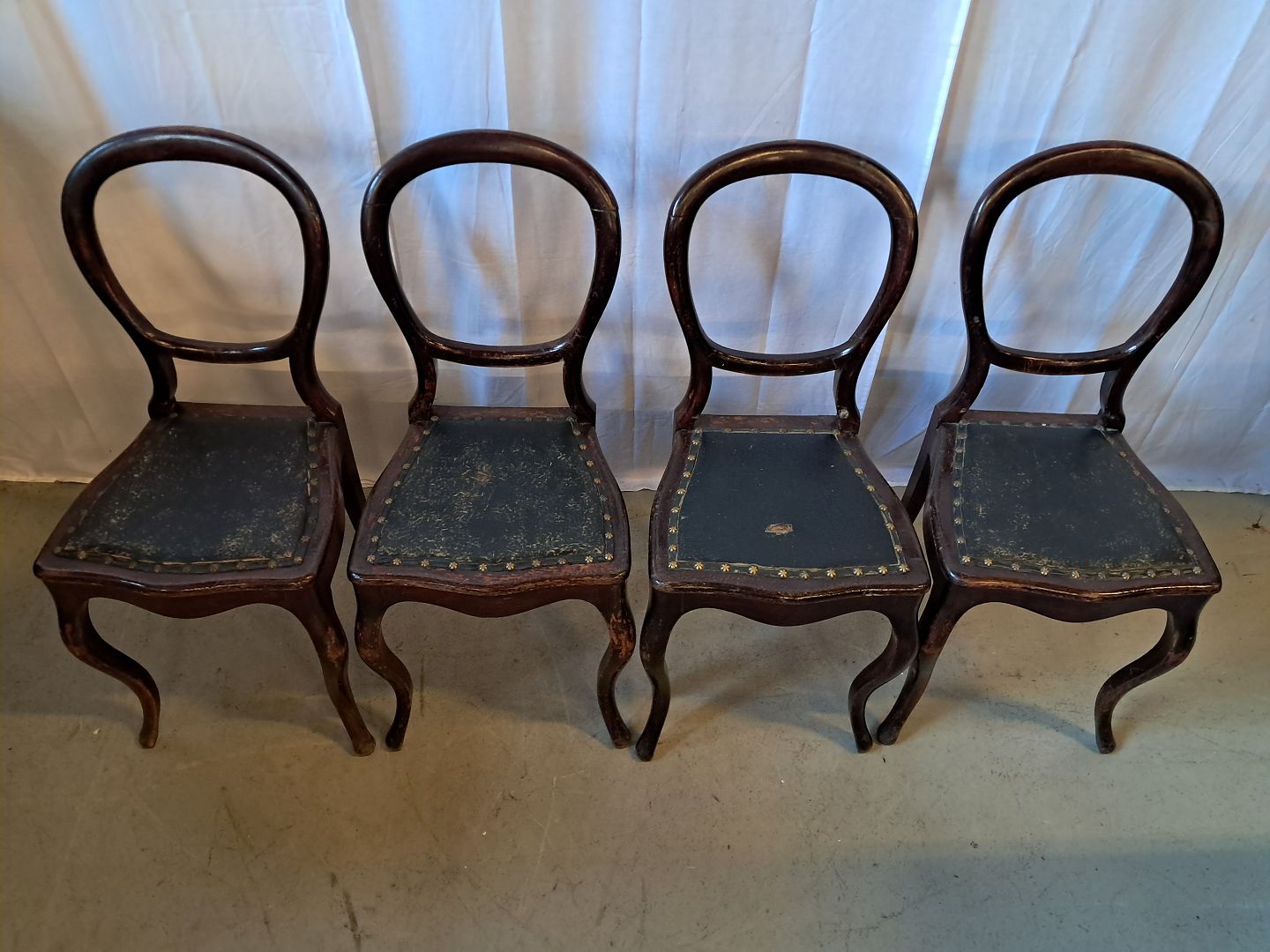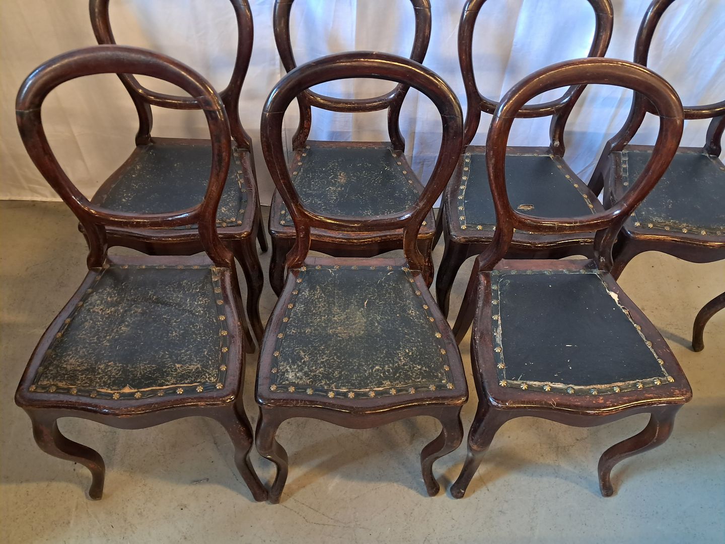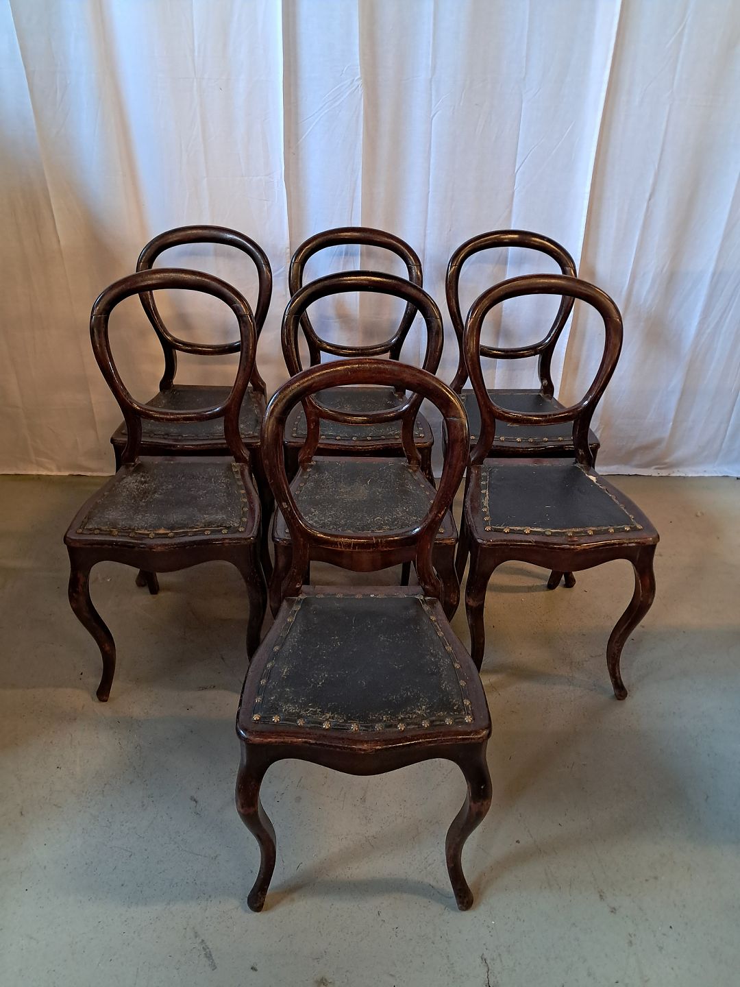 7 Stole i massivt bøgetræ, fra 1910erne.De har brugsspor og defekt polstring.