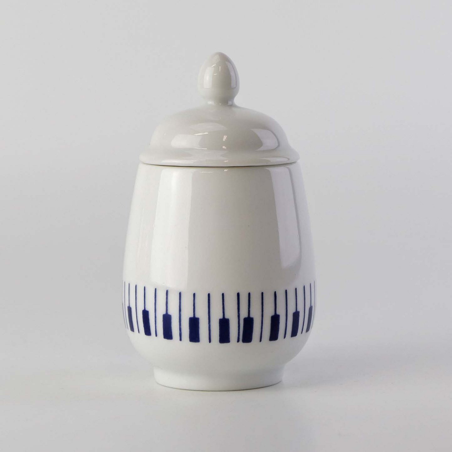 Stellet er fremstillet i ildfast glat porcelæn dekoreret med mørkeblå tangenter på hvid baggrund.