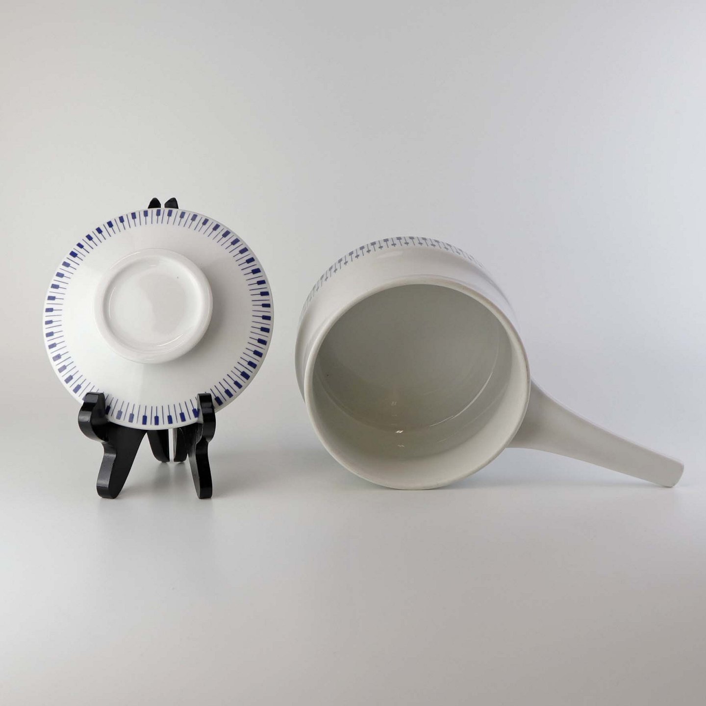 Stellet er fremstillet i ildfast glat porcelæn dekoreret med mørkeblå tangenter på hvid baggrund.