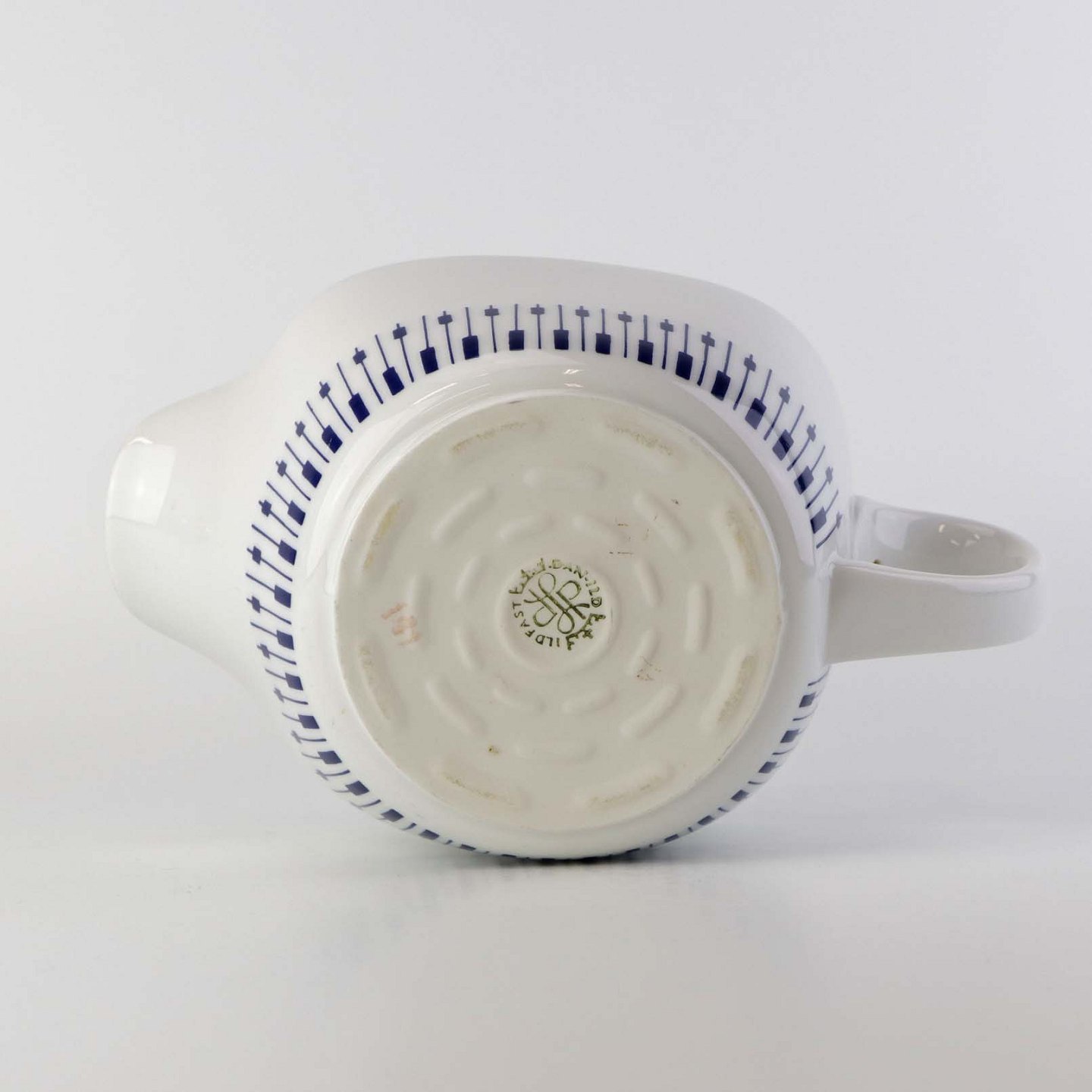 Stellet er fremstillet i ildfast glat porcelæn dekoreret med mørkeblå tangenter på hvid baggrund.