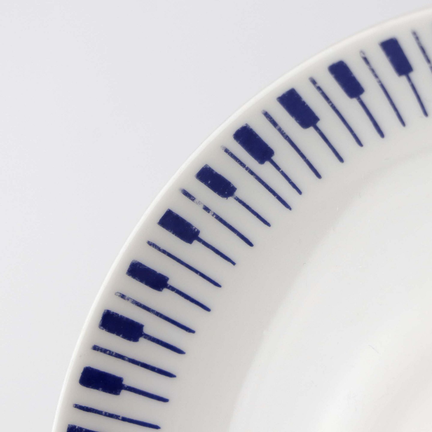 Stellet er fremstillet i ildfast glat porcelæn dekoreret med mørkeblå tangenter på hvid baggrund.