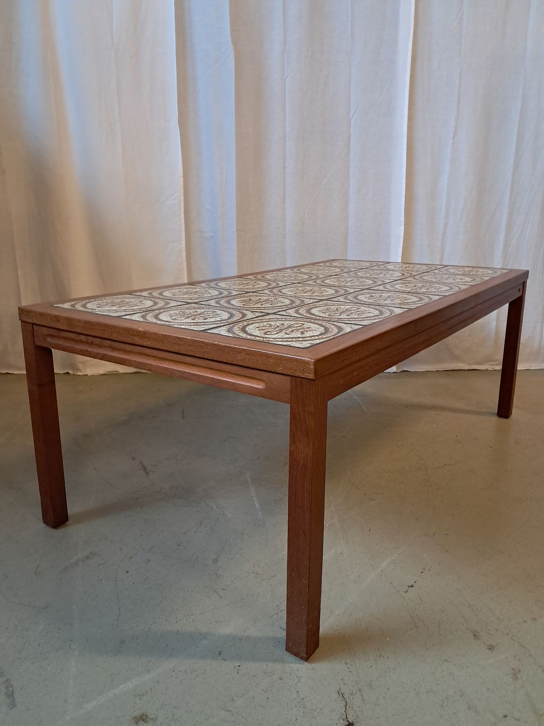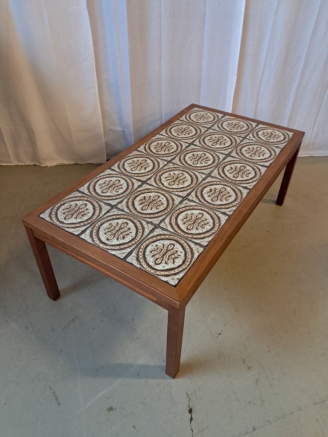 Sofabord i fineret teaktræ med kakler, fra 1960erne.Det har brugsspor.