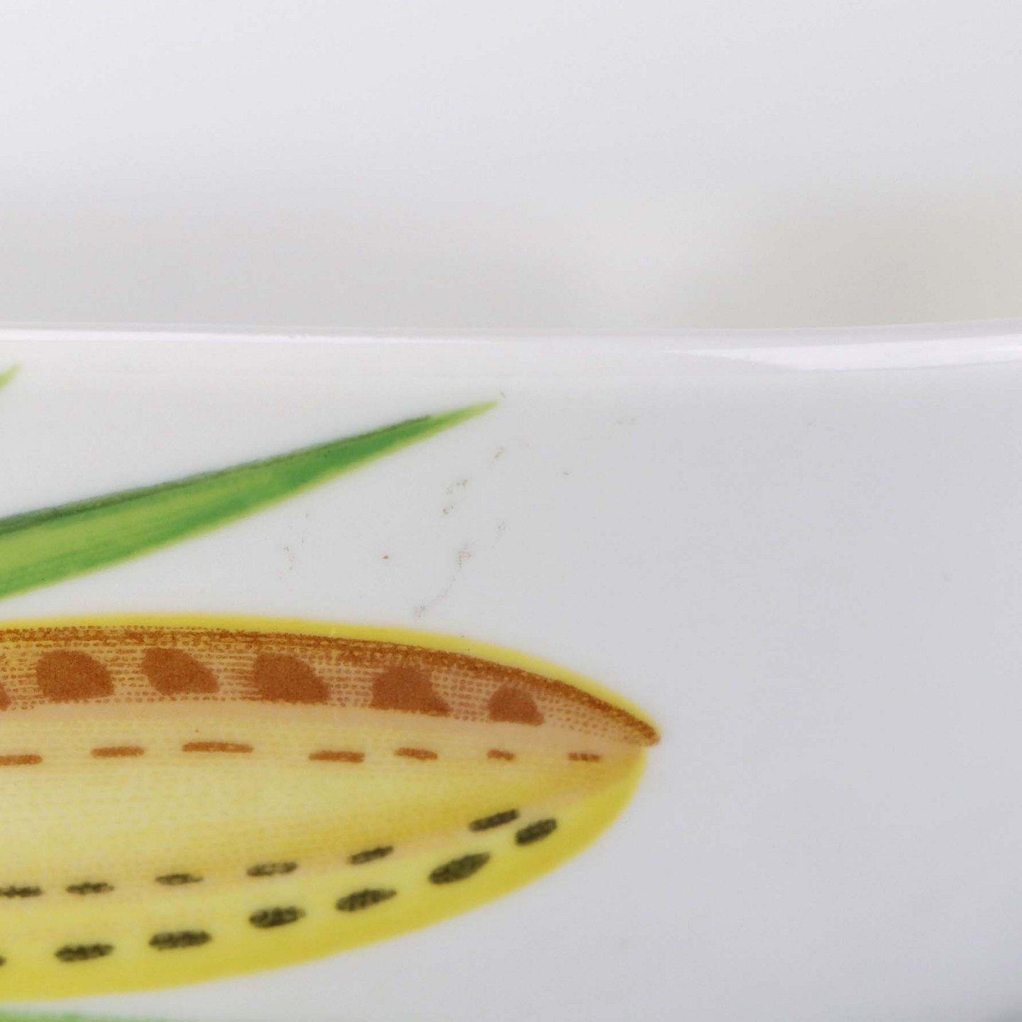 Stellet er i glat hvidt porcelæn med varierende farverige motiver af frugter og grønt.