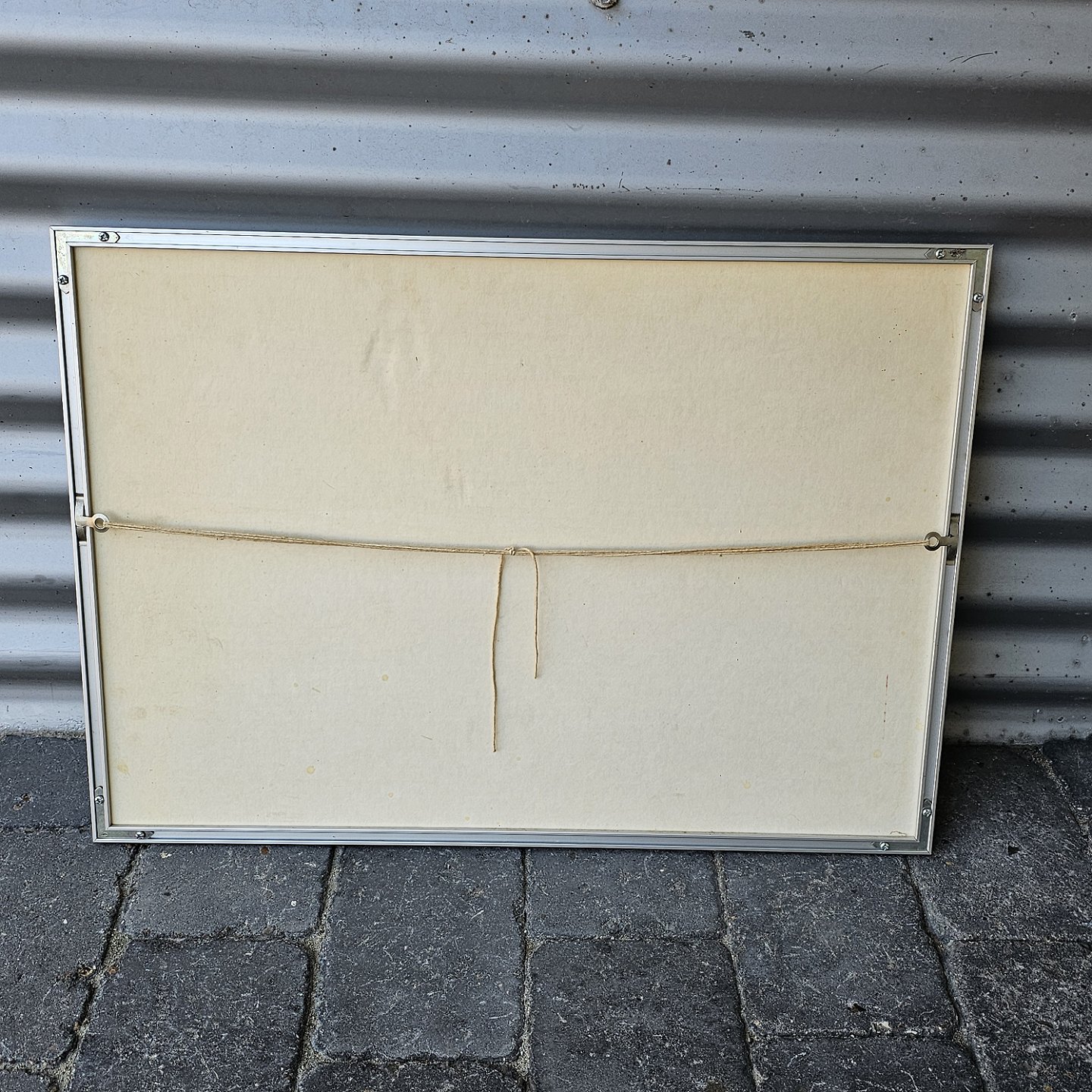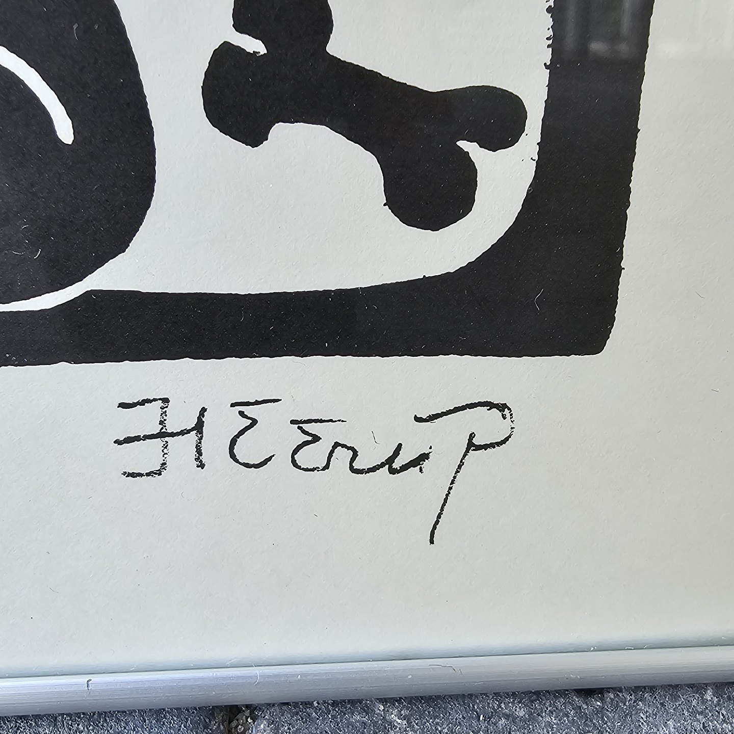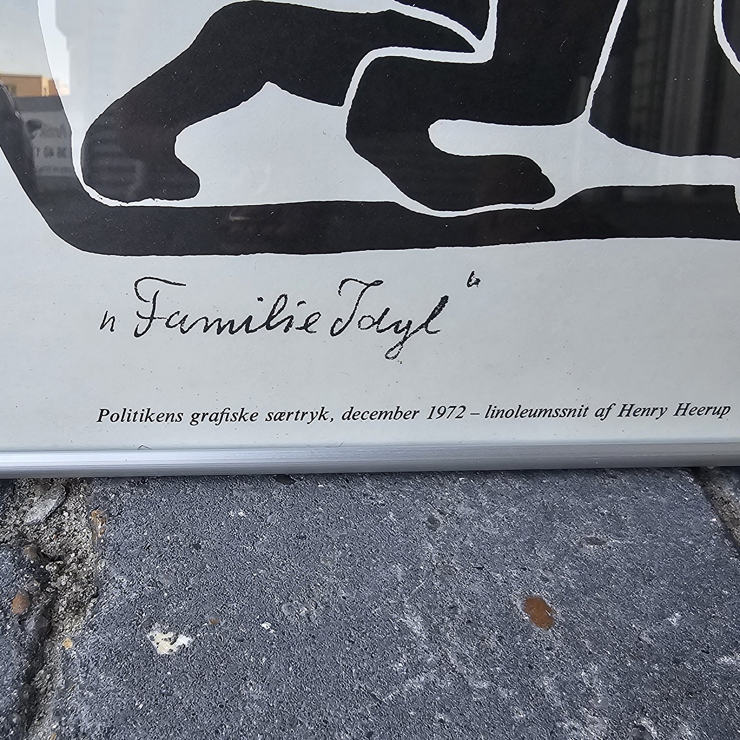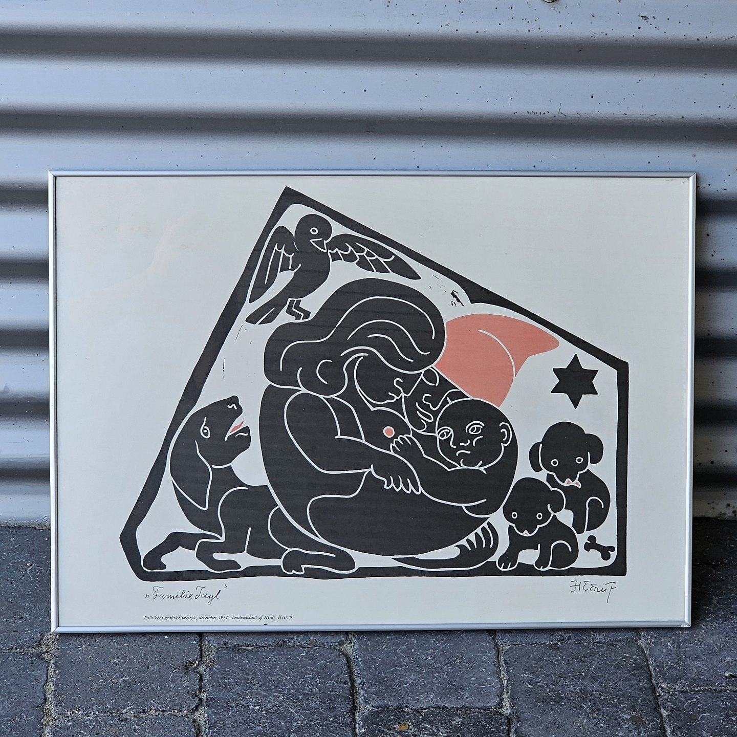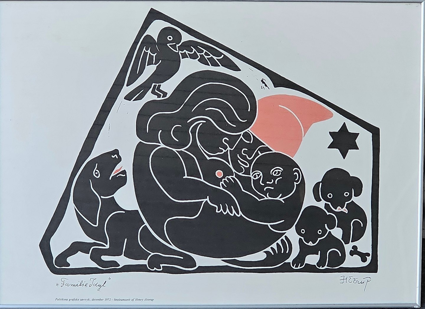 Indrammet litografi i hvid ramme. Grafisk tryk i sort, hvidt og rødt under titlen Familieidyl. Motivet viser mor med barn og hund med hvalpe under en svævende fugl og et rødt hjerteKunstner Henry Heerup f. 1907-1993