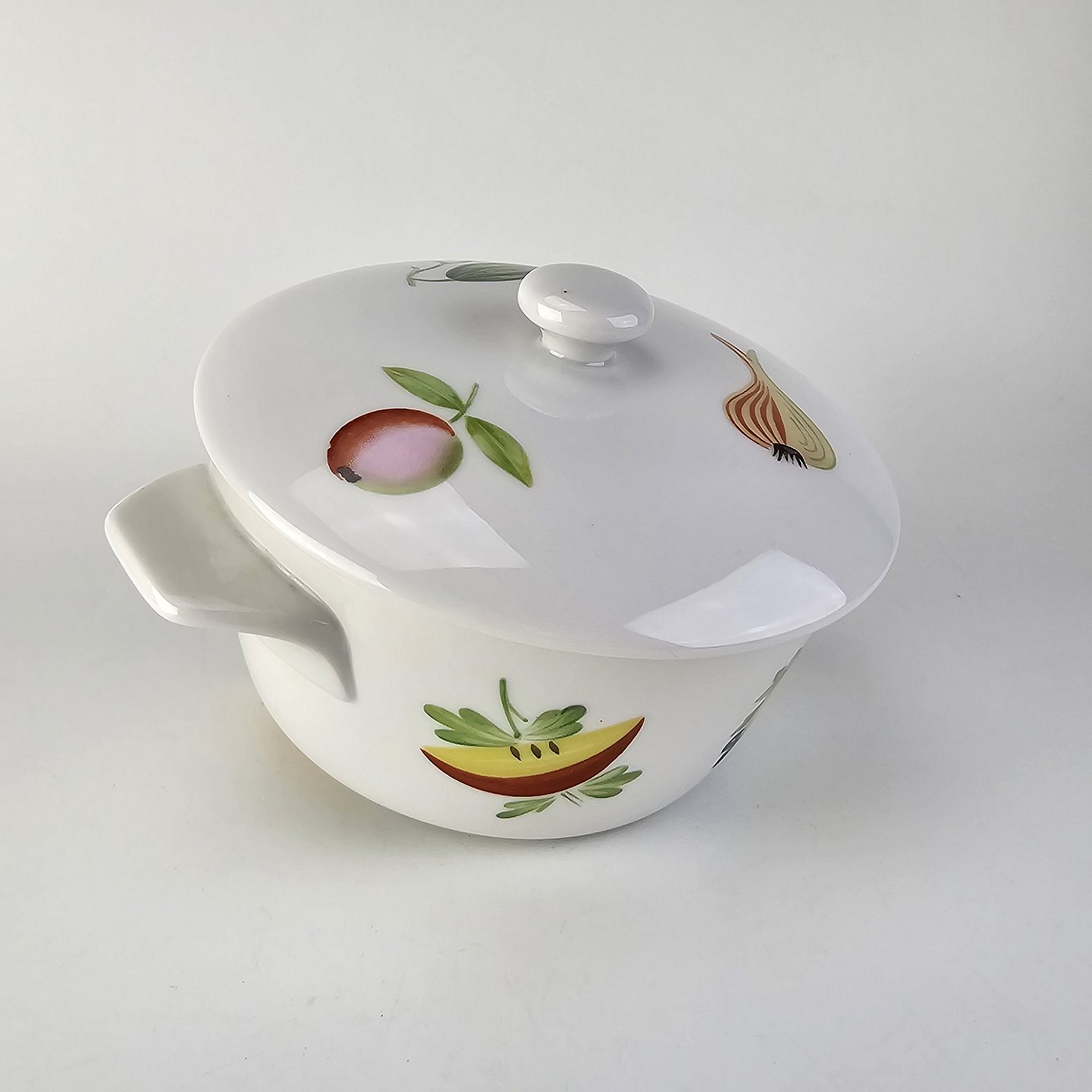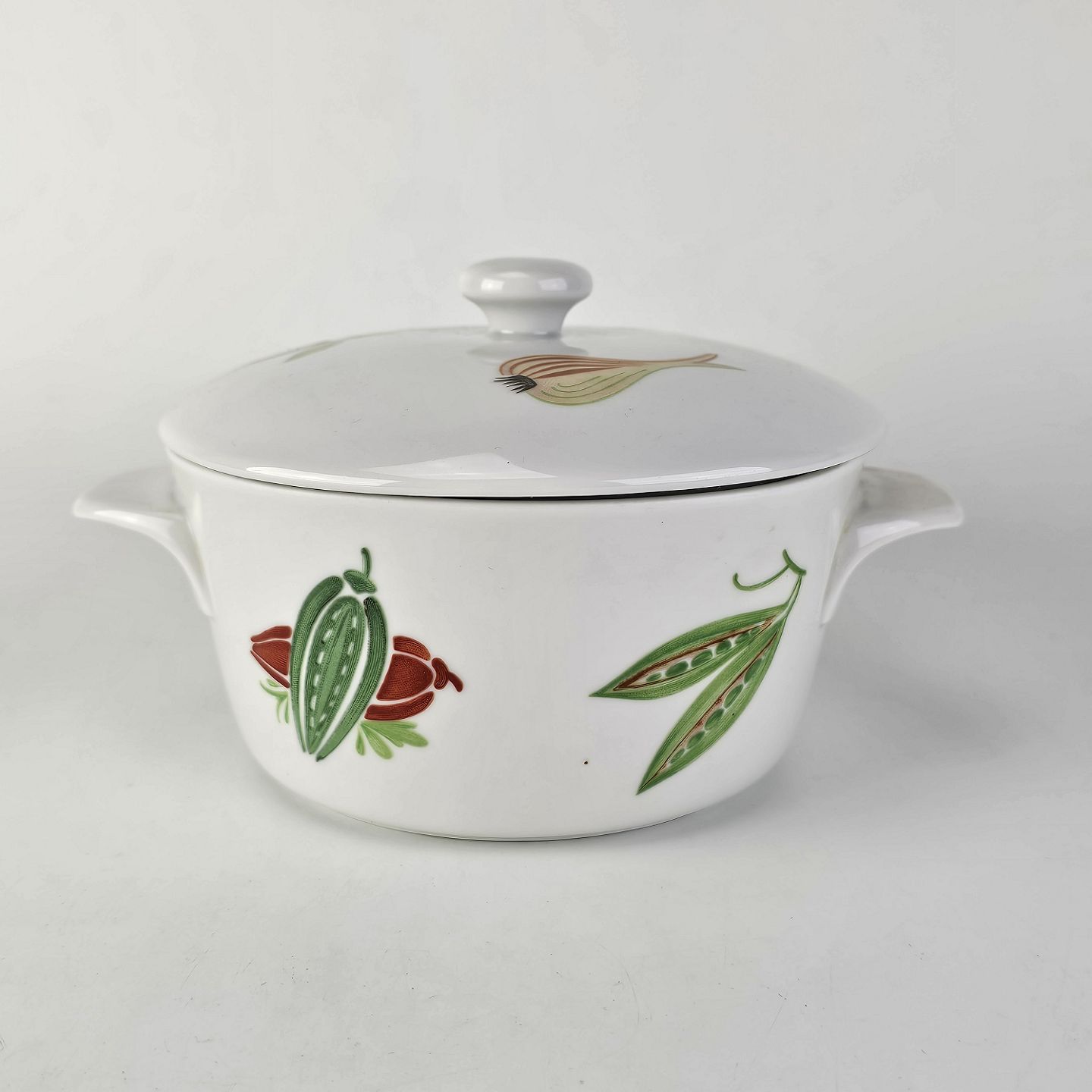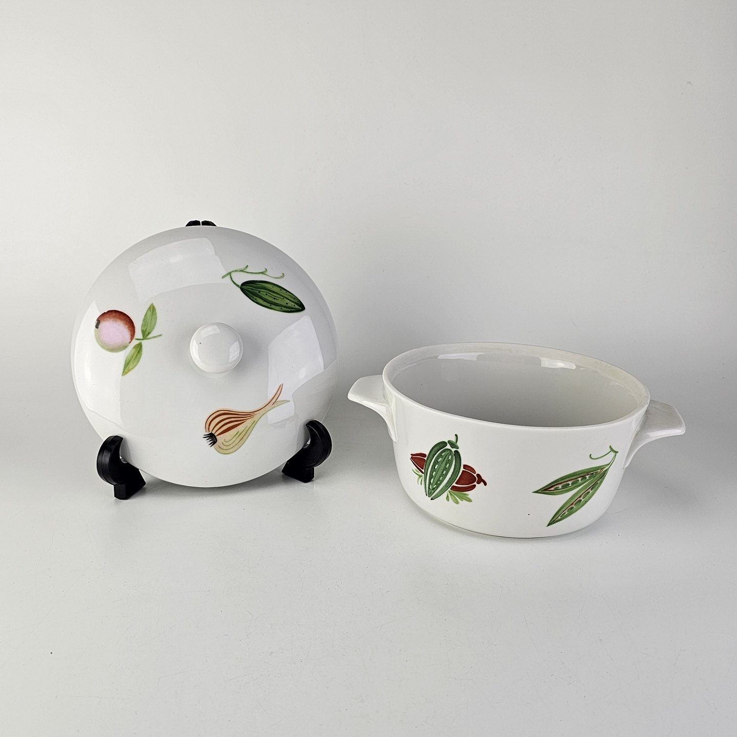Fad med låg i porcelæn fra stellet Danild 50 Frugt og grønt - også kendt som Picnic stelletProducent Porcelænsfabrikken Danmark, Lyngby