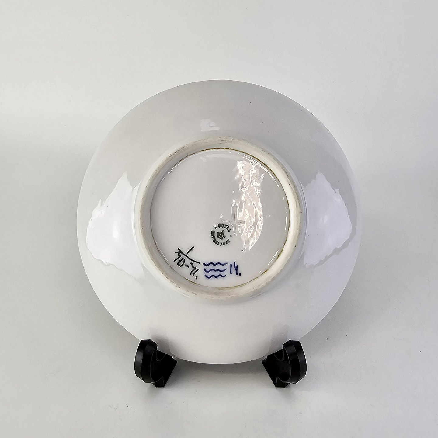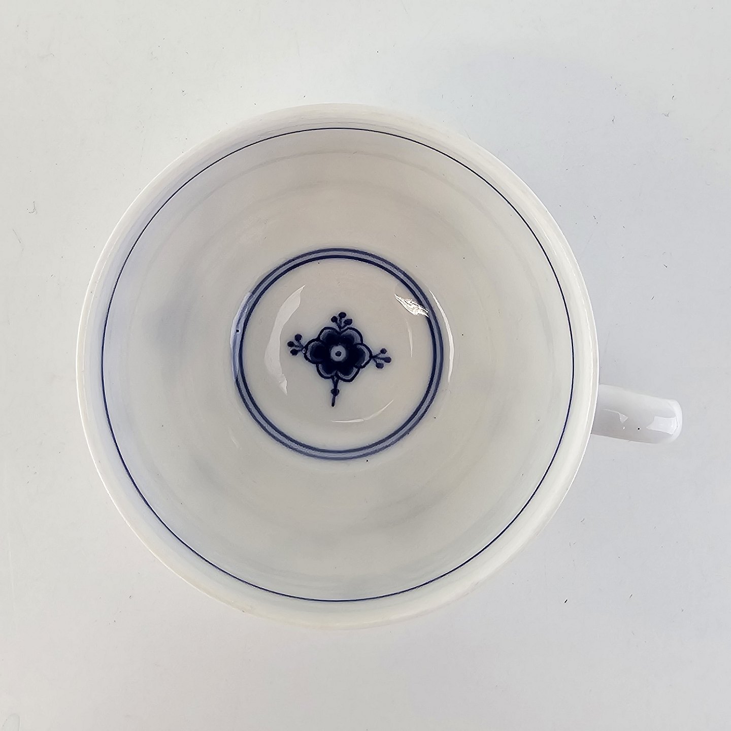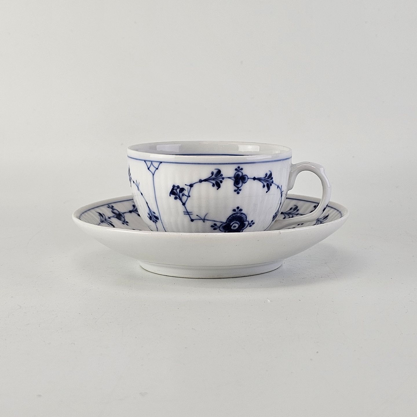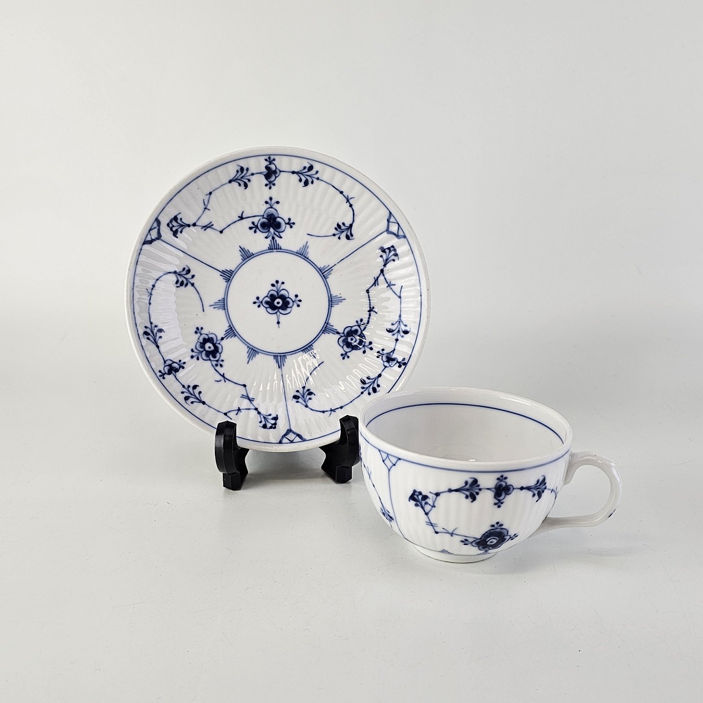 Kop og underkop i hvidt porcelæn fra stellet Musselmalet Riflet1/70 med bemaling indvendigt i kop